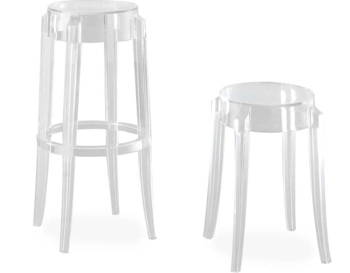 "Charles Ghost Stool(查尔斯鬼凳),由鼎鼎大名Philippe starck(菲利浦·史塔克)设计;进口高透明度工程塑料PC一体成型,简洁新潮,高净度透明材质很好的