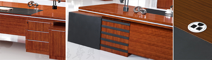 ※  上图为班台细节图片展示,皮革写字板,黑色纯漆条纹饰边条,圆形不锈钢过线孔!