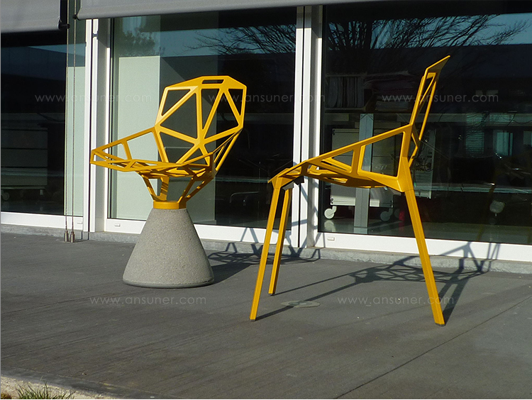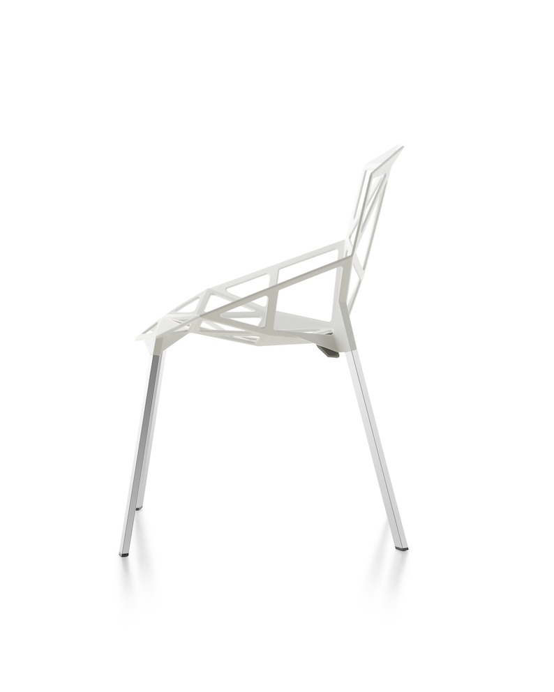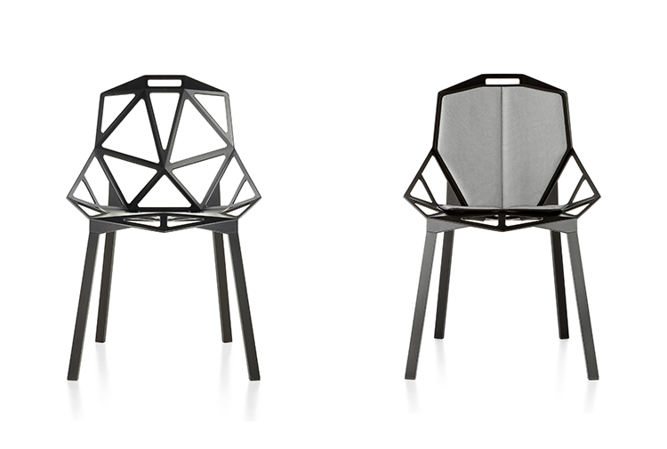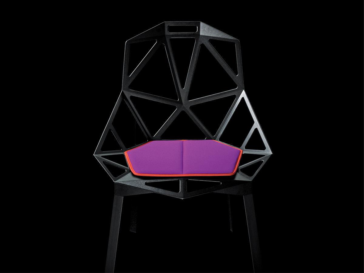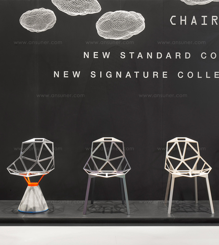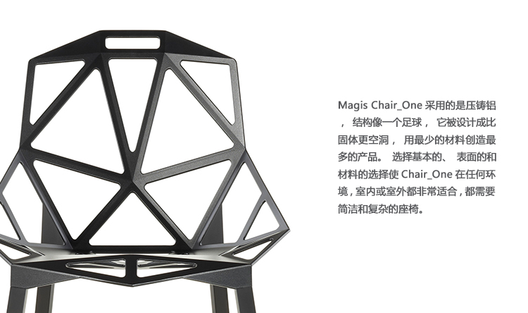 最受瞩目的德国设计师Konstantin Grcic 应邀为MAGIS 设计的Chair One(几何吧椅),是设计生涯中最具有标志的产品之一。办公椅体为模铸铝合金结构,经过氟化钛镀膜与塑料粉末涂布。椅子具有阻燃性、抗腐蚀性。适合室内及室外使用。以铝金属与钛金属制成的 Chair One,以多个平面以不同角度组合而成,建立起立体的外型。多个中空的三角型组合而成的座椅,不但令为用家带来强而有力的承托结构,而且还能在简单设计之中带出不一样的风格。这把椅子的惊人形象难免使人对它的舒适度产生疑问,但当你真正坐于其上,你会发现它实际上非常舒适,那些稀疏的网状结构能够极好地支撑不同体型的人体,后背上的把手也非常实用。当你知道Chair-One最初是被当作户外用椅而设计的,你会更加佩服Konstantin Grcic的缜密用心:极少的表面可以杜绝雨水,并且减少灰尘堆积,夸张的形态则令它能够在街道、建筑或自然的环境中拥有自己美学上的存在,而不是被环境所吞没。Konstantin Grcic花了三年时间设计Chair One,自2003年诞生以来,堪称Grcic精简主义风格的代表作。2006年,Chiar One为Konstantin Grcic赢得了德国政府的设计大奖。