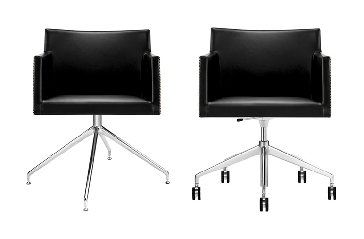 Masai有扶手椅,软垫包括各种皮革和织物。 基本选项包括:四条腿用匹配的皮革或织物覆盖,铝制支架底座带或不带脚轮,铝制五向底座带倾斜和升降机构,带或不带脚轮。