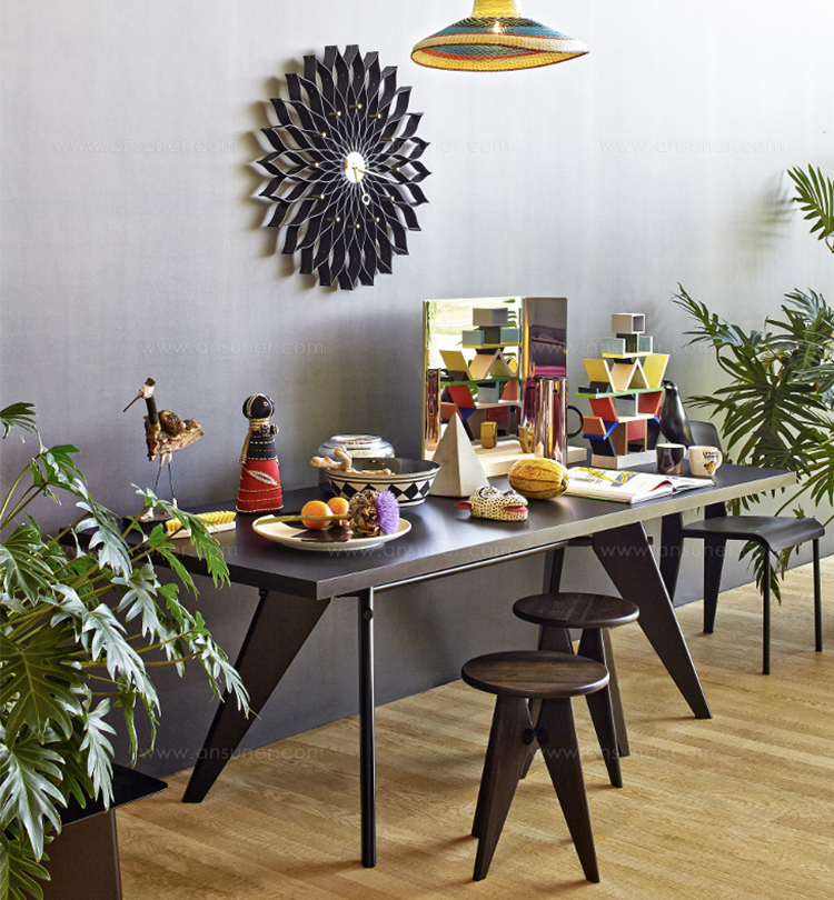 JeanProuvé的EM Table的美学外观坚持结构原则,说明其结构中的力和应力流动。 它有各种尺寸,桌面采用优质实木或HPL层压板,颜色可供选择。 长度为2000或2400毫米的顶部也有橡木贴面。 由于这种广泛的选择,每个餐厅都可以找到理想的EM Table。