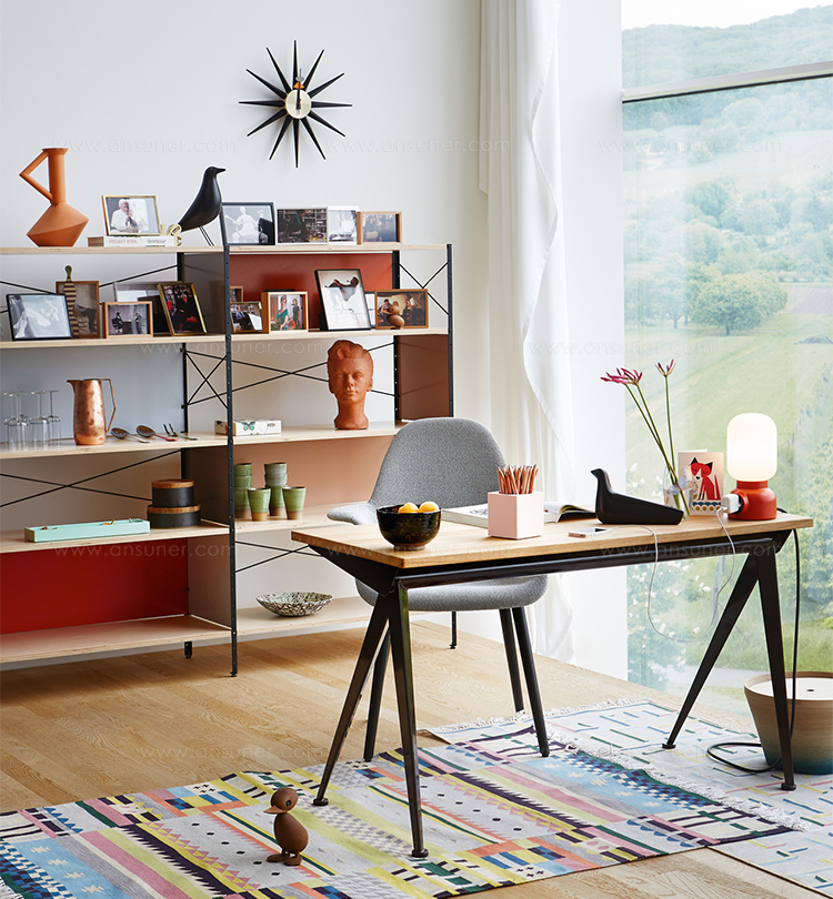 由JeanProuvé设计的Compas Direction办公桌,优雅的金属腿让人想起指南针的铰链臂 - 法语中的“le compas”。 他们的设计基于工程原理,代表了法国设计师和工程师的结构方法。 与涂油的实木桌面搭配,它们在家庭办公室形成了丰富的对比材料组合。