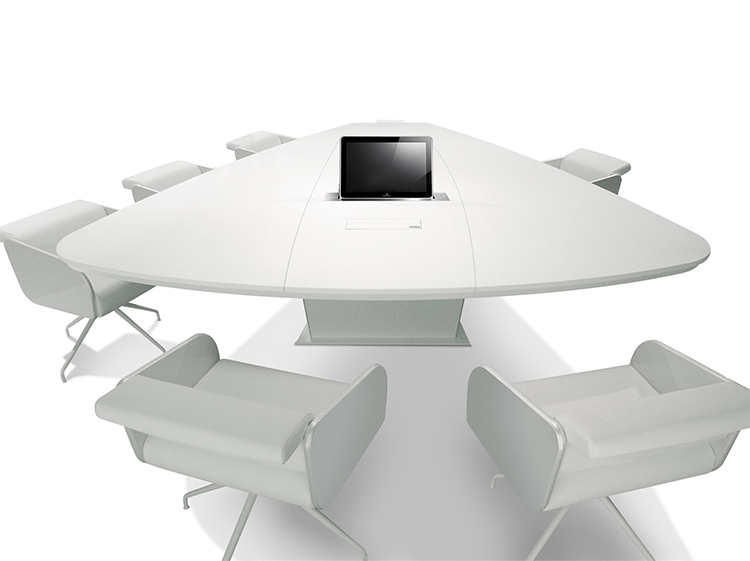 会议桌。水滴形顶部。它较窄的一端可能会召回一艘船的船。顶部分为三个平行区域,允许不同材料和饰面的组合。50mm厚的顶部由两部分组成:盖子和45o斜面底盖。表目的设计是进行预测,演示和多媒体会议。可选的集成伸缩式计算机监控系统,电缆管理和其他电子部件。倾斜的棱柱形底座由金属结构制成,金属结构固定在金属板上,并用可拆卸的面板封闭,可以方便地进入桌子内部,以便进行电缆管理和维护。表面处理:混合成品顶部采用木材,微纹理漆或Techno Leather软垫。以漆面为基础。