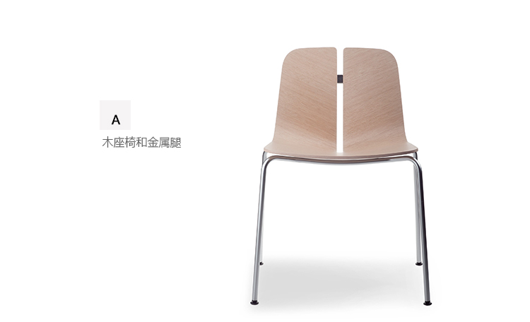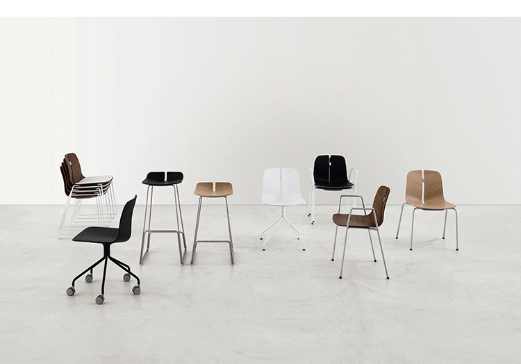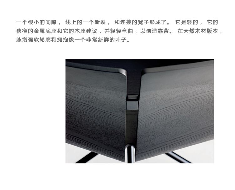 一个很小的间隙,一条线的中断,和连接的凳子形状。它是轻的,就像它狭窄的金属底座和木质座椅所暗示的那样,轻轻弯曲形成靠背。在自然的木材版本,纹理加强了柔软的轮廓和拥抱像一个非常新鲜的叶子,突出其结构的轻盈性。