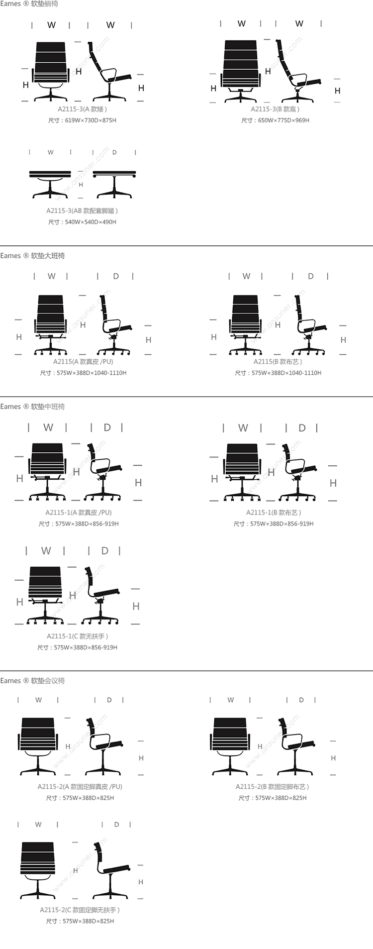 Charles与RayEames夫妇是20世纪最有影响力的设计师,卓越的设计涵盖了家具、建筑、影像与平面设计。他们从二次世界大战中美国海军的实验计画中学习经验并发展可谓是现今工业中使用模铸胶合版的先锋,这对设计界的超级夫妇档自1940年参与了由MOMA举办的有机家具设计大赛,自今已有近百件他们的作品被各大博物馆所永久典藏。Eames® Soft Pad Executive Chair(伊姆斯软包大班椅)是夫妻俩1958年设计的,是在全铝系列的基础上发展的另一系列Eames产品。舒适系列在全铝的椅架上增加了皮革制的柔软坐垫和靠背,高级铝合金制作,压模五星脚,可旋转。背垫和坐垫,采用西皮,具有透气性强,内部填充高密度定型绵,不易变形,不老化,依人体坐姿,符合人体工学,耐水及对人体无害等优势。椅子扶手选用优质电镀铝合金扶手,手感舒适,永久不生锈。转椅底盘为多功能底盘,可以保护使用者长时间坐用腿部健康,且作为高度可多定位调节。气压棒采用的气杆是正规厂家出产的外贸气杆,每一根气杆都有钢印,经过严格SGS检测的才可出厂,旋转、升降自如基本无声响,使用寿命长,可承受250kg,可升降数万次,将椅面调至与膝盖同高时,使用者坐下后双脚跟可垂直平放于地上,且大腿与地面平行,最符合人体工学理论,使用者长期久坐,也不想疲惫。办公椅脚为铝合金材质永久不生锈、承受能力强,安全更放心。椅子脚轮采用优质电镀片脚轮,耐用而美观,可以随意变换位置,贴心更方便,具有防震及防松脱,让椅子的安全性能更加可靠。