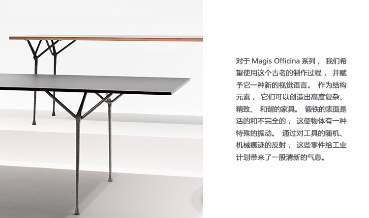 设计师罗南(Ronan)和Erwan Bouroullec用办公桌边设计了一种古老的锻造和锤击铁,用来制作各种形状。他们的目标是“利用这个古老的制造过程,给它一种新的视觉语言,”Erwan说。语言具有真实性和思想性。罗南指出:“通过对那些赋予它们形状的工具的随机、机械痕迹的反射,这些东西给工业计划带来了一股清新的气息。”