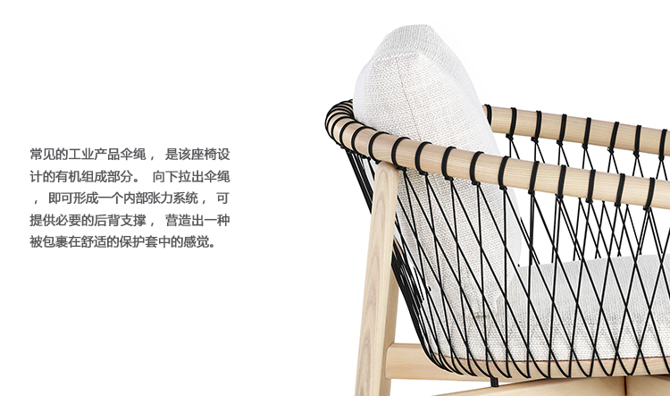 降落伞绳索,一种常见的工业产品,是其设计的一个组成部分。被拉下后,这些电线形成了一个内部张力系统,并提供必要的背部支撑,创造了一种被封闭在一个舒适的、保护性的鸟巢中的感觉。由于其简单、经典的外形,十字形座椅可以在各种环境下工作,从行政办公室或接待区到曼哈顿的顶层公寓或郊区客厅。