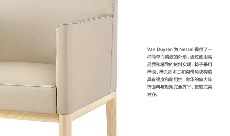 古典现代主义对范杜尔森的设计产生了重要的影响,法国建筑师让-米歇尔·弗兰克的作品也是如此,他在三十年代进行了实践,并以其整洁但奢华的家具而闻名于世。在这些灵感来源的激励下,范杜森给了奈塞尔一个简单而复杂的形象,这是通过使用高质量和精良的材料来实现的。椅子是由榫和榫,细木工和凹槽角块构成的强度和耐久性。豪华的装潢面料与框架完全齐平,接缝也是完美的排列。