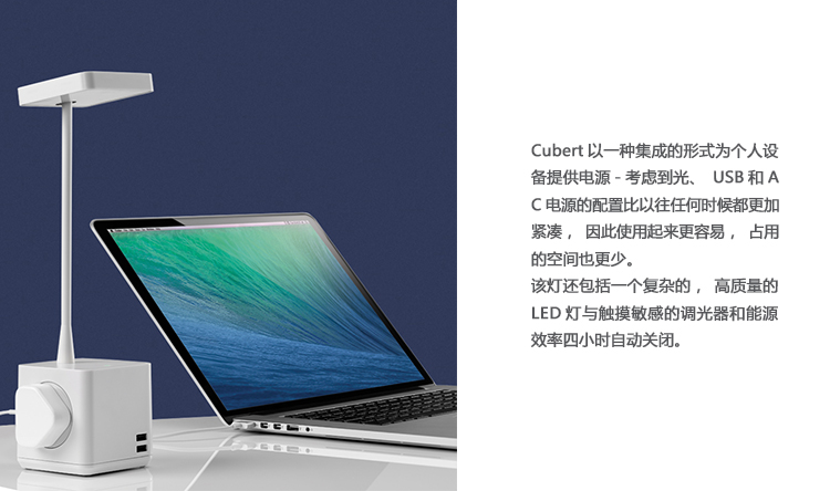 Cubert以集成的形式为个人设备提供电力——将光、USB和AC电力的配置考虑在内,这比以往任何时候都更加紧凑,因此它更容易使用并且占用更少的空间。