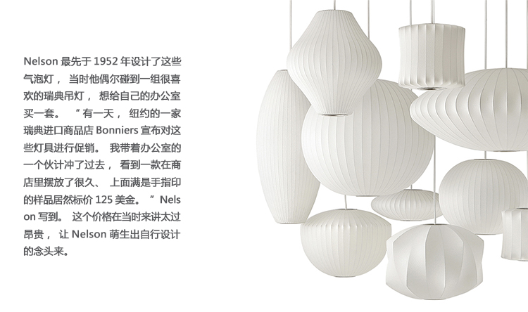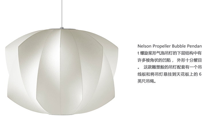 Nelson Propeller Bubble Pendant螺旋桨形气泡吊灯的下层结构中有许多棱角状的凹陷,外形十分醒目。这款雕塑般的吊灯配套有一个吊线板和将吊灯悬挂到天花板上的6英尺吊绳。Nelson最先于1952年设计了这些气泡灯,当时他偶尔碰到一组很喜欢的瑞典吊灯,想给自己的办公室买一套。“有一天,纽约的一家瑞典进口商品店Bonniers宣布对这些灯具进行促销。我带着办公室的一个伙计冲了过去,看到一款在商店里摆放了很久、上面满是手指印的样品居然标价125美金。”Nelson写到。这个价格在当时来讲太过昂贵,让Nelson萌生出自行设计的念头来。