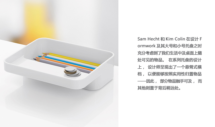 Sam Hecht和Kim Colin在设计Formwork及其大号和小号托盘之时充分考虑到了我们生活中及桌面上随处可见的物品。在系列托盘的设计上,设计师呈现出了一个悬臂式横档,以便能够按照实用性归置物品——因此,部分物品触手可及,而其他则置于背后稍远处。