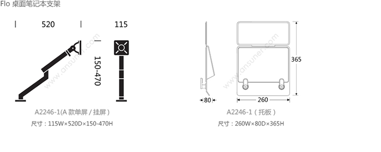 Flo 桌面笔记本支架 系列尺寸/示意图