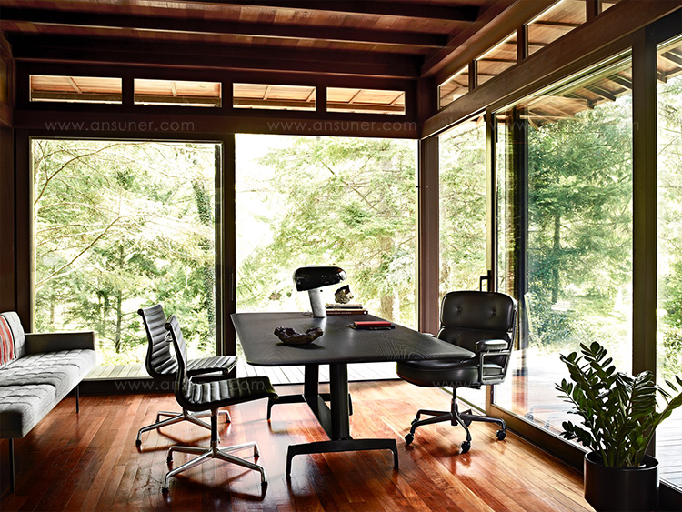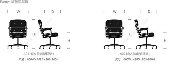 Charles与RayEames夫妇是20世纪最有影响力的设计师,卓越的设计涵盖了家具、建筑、影像与平面设计。他们从二次世界大战中美国海军的实验计画中学习经验并发展可谓是现今工业中使用模铸胶合版的先锋,这对设计界的超级夫妇档自1940年参与了由MOMA举办的有机家具设计大赛,自今已有近百件他们的作品被各大博物馆所永久典藏。 Eames® Soft Pad Side Chair(伊姆斯软包会议椅)是夫妻俩1958年设计的,是在全铝系列的基础上发展的另一系列Eames产品。舒适系列在全铝的椅架上增加了皮革制的柔软坐垫和靠背,高级铝合金制作,压模四星脚,可旋转。背垫和坐垫,采用西皮,具有透气性强,内部填充高密度定型绵,不易变形,不老化,依人体坐姿,符合人体工学,耐水及对人体无害等优势。椅子扶手选用优质电镀铝合金扶手,手感舒适,永久不生锈。转椅底盘为多功能底盘,可以保护使用者长时间坐用腿部健康,且作为高度可多定位调节。气压棒采用的气杆是正规厂家出产的外贸气杆,每一根气杆都有钢印,经过严格SGS检测的才可出厂,旋转、升降自如基本无声响,使用寿命长,可承受250kg,可升降数万次,将椅面调至与膝盖同高时,使用者坐下后双脚跟可垂直平放于地上,且大腿与地面平行,最符合人体工学理论,使用者长期久坐,也不想疲惫。办公椅脚为铝合金材质永久不生锈、承受能力强,安全更放心。椅子脚轮采用优质电镀片脚轮,耐用而美观,可以随意变换位置,贴心更方便,具有防震及防松脱,让椅子的安全性能更加可靠。