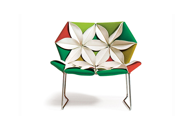 Antibodi 是 Patricia Urquiola 從一個花朵盛開的概念所創作的椅子,蜂窩式三角形花瓣串連縫製而成花朵散播在椅面上,片片花瓣的外型和多層次的材料,衍伸出豐富的圖案。