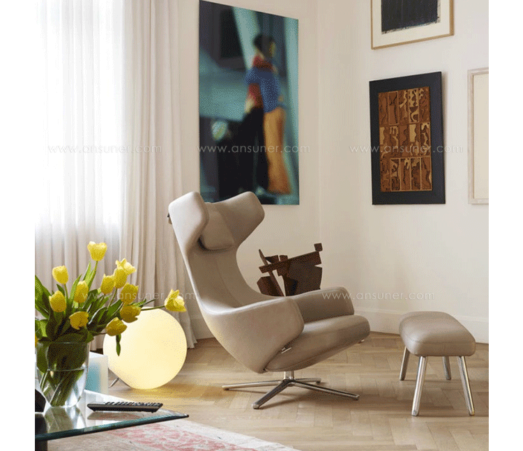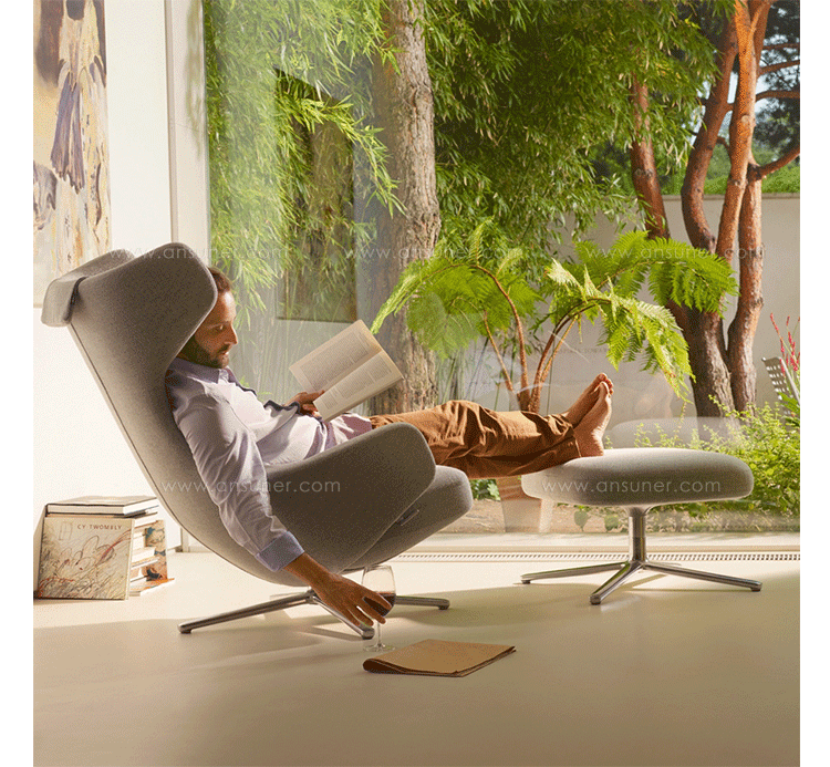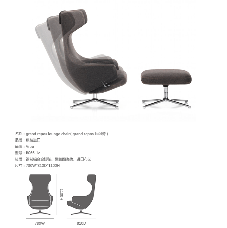 grand repos lounge chair and ottoman(grand repos 休闲椅&脚踏)由设计大师Antonio Citterio所设计的独特的,绝无仅有的休闲椅系列,椅子的创作面临的挑战如同伊姆斯夫妇当初设计著名的伊姆斯休闲椅一样,但正因如此,才能成为绝世经典。grand repos系列休闲椅采用钢制铝合金脚架、聚氨酯海绵填充、高级布艺扪面,可随意调整坐姿和高度,也可以放平躺,配上舒适的羽毛衬垫,无论阅读或者休憩,都非常舒服,符合人体工学,高档舒适,是办公,会议的理想选择。意大利设计师和建筑师 Antonio Citterio赋予了这边椅子永恒的优雅气质与无与伦比的舒适,是当代设计的经典,无论用在办公、商业、家庭都是非常高贵大气的。