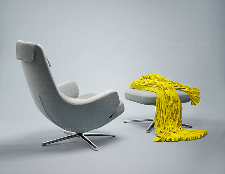 "repos lounge chair and ottoman(repos休闲椅&脚踏)由设计大师Antonio Citterio所设计。repos系列休闲椅采用钢制铝合金脚架、聚氨酯海绵填充、高级布艺扪面,可随意调整坐姿和高度,也可以放平躺,配上舒适的羽毛衬垫,无论阅读或者休憩,都非常舒服,符合人体工学,高档舒适,是办公,会议的理想选择。意大利设计师和建筑师 Antonio Citterio赋予了这边椅子永恒的优雅气质与无与伦比的舒适,是当代设计的经典,无论用在办公、商业、家庭都是非常高贵大气的。