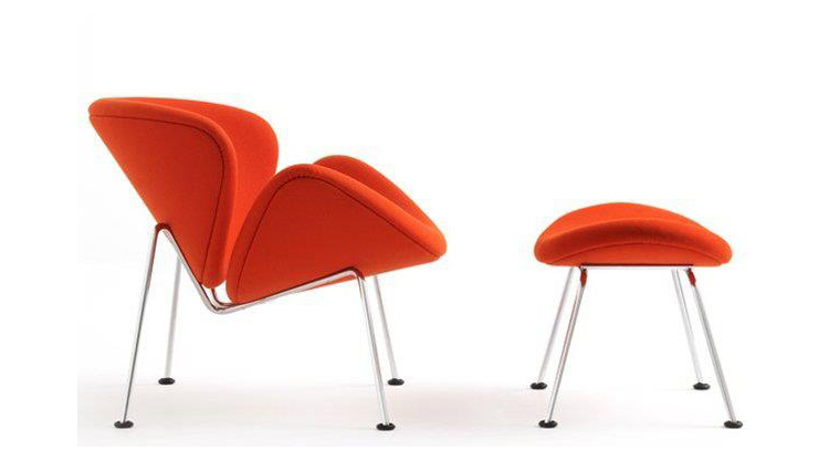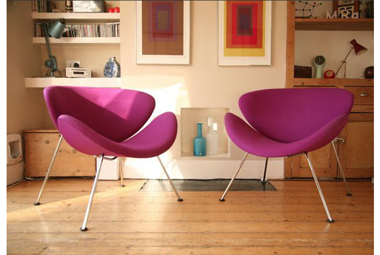 Paulin Slice Chair (橙片椅)也可以称为橘瓣椅,是由著名设计师Pierre Paulin设计的,从桔瓣椅的设计就能看出Pierre Paulin是具有国际性视野和前瞻性的前卫设计师,桔瓣椅全手工制作,针线走得直、流畅、缝线美观、均匀且自然,线条优美。这个经典的设计经历过时间的洗涤看上去仍然象刚设计出来一样。有谁看见由2片简单的橙瓣组成的颜色鲜艳椅子而不心动呢?从不同的角度,橙色片展示了几个阶段的“卷起来”。事实上,椅子几乎从每个角度看都呈现出不一样的优雅。橙片椅布料可为PU,真皮,植绒,羊绒布等多种面料,脚架为电镀铁架,颜色可多选。可用于餐厅,咖啡厅,接待厅,电影院等候室,VIP休闲室等多种商业场所。