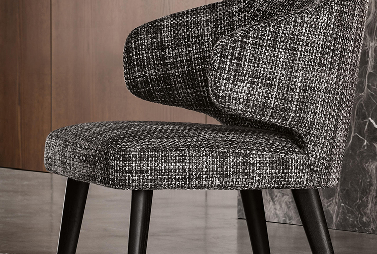 沙发的围裹式靠背特色十足,扶手线条与之完美呼应,以蓝灰色调呈现的压铸铝合金支脚尽展精致设计之美。