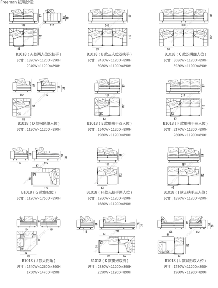 Freeman 绒毛沙发 系列尺寸/示意图