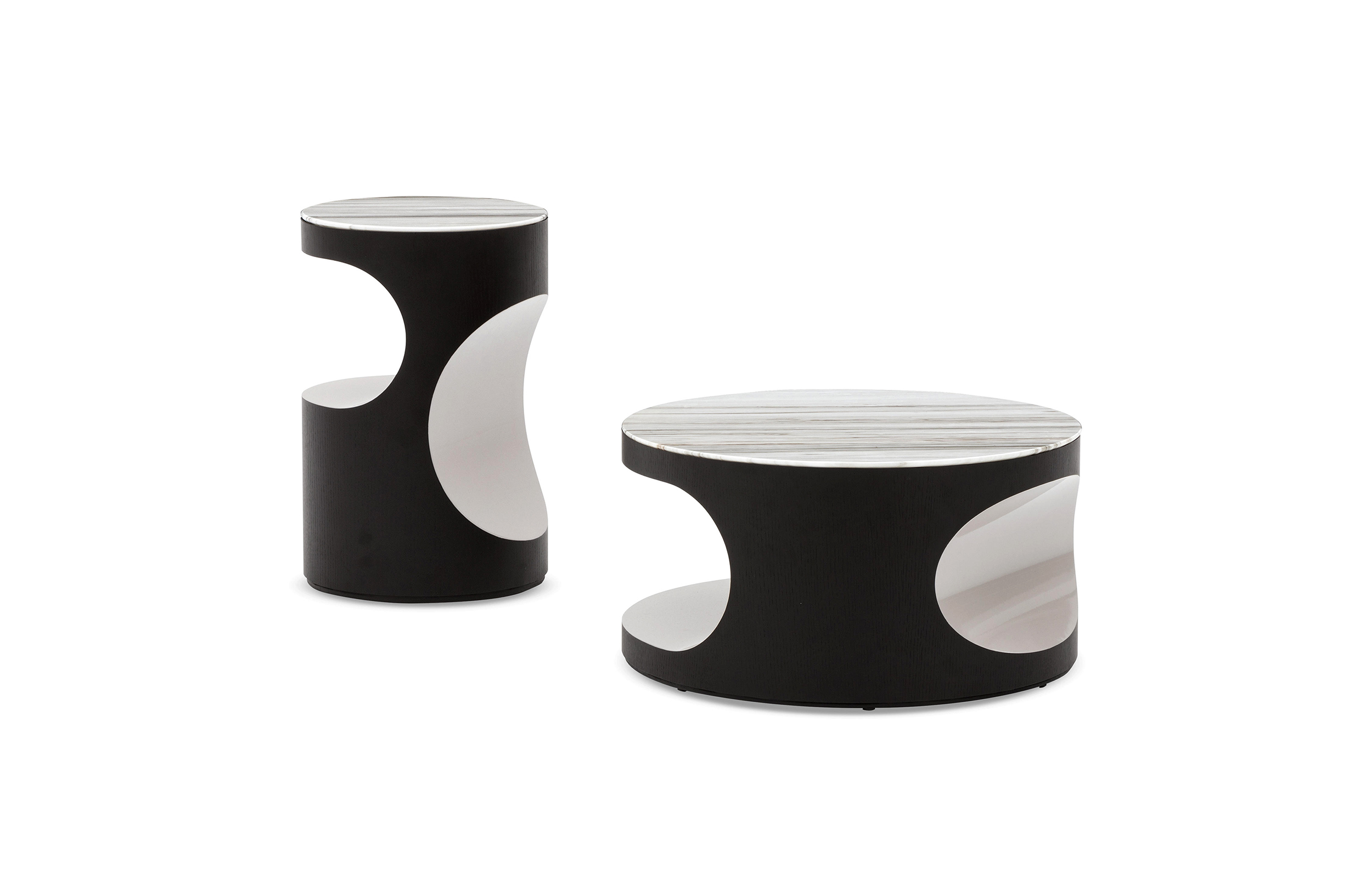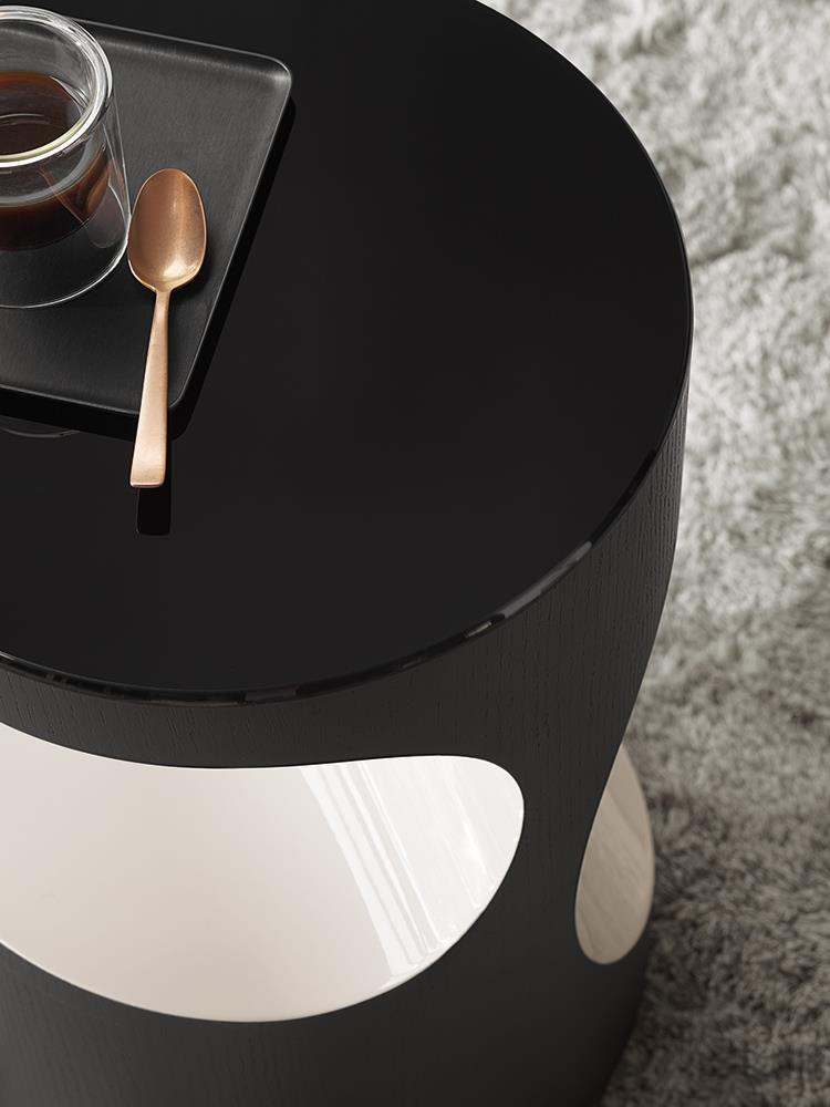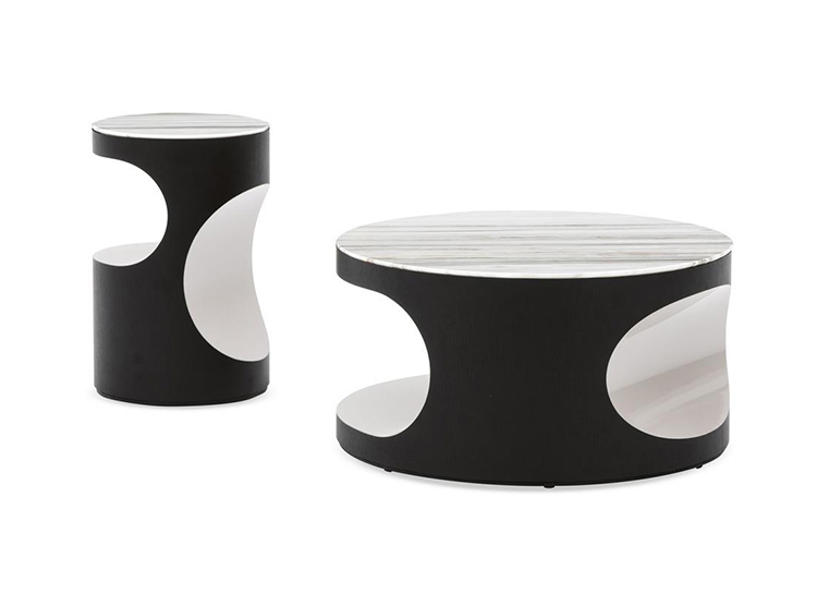 Boden有两种不同的高度和不同的比例,在侧桌版本中更纤细,在咖啡桌的解决方案中更紧凑,Boden被黑色的pate de verre或Zebrino大理石覆盖。