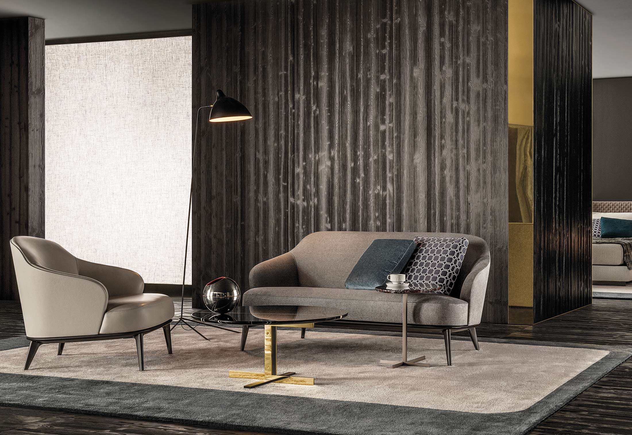如果说Catlin边柜的设计崇尚简洁,那么材质的选择则旨在打造非凡的视觉和触觉效果。金属基座有着精致的十字形地面支撑腿,其中包括颇有趣味的组合:黑色压花搭配铬色或金色的抛光表面,打造出多种多样的风格。材料的搭配体现出非凡的优雅感,台面可以选择两种珍稀名贵的大理石,Arabescato Purple或Sahara Noir,两者都拥有抛光表面。