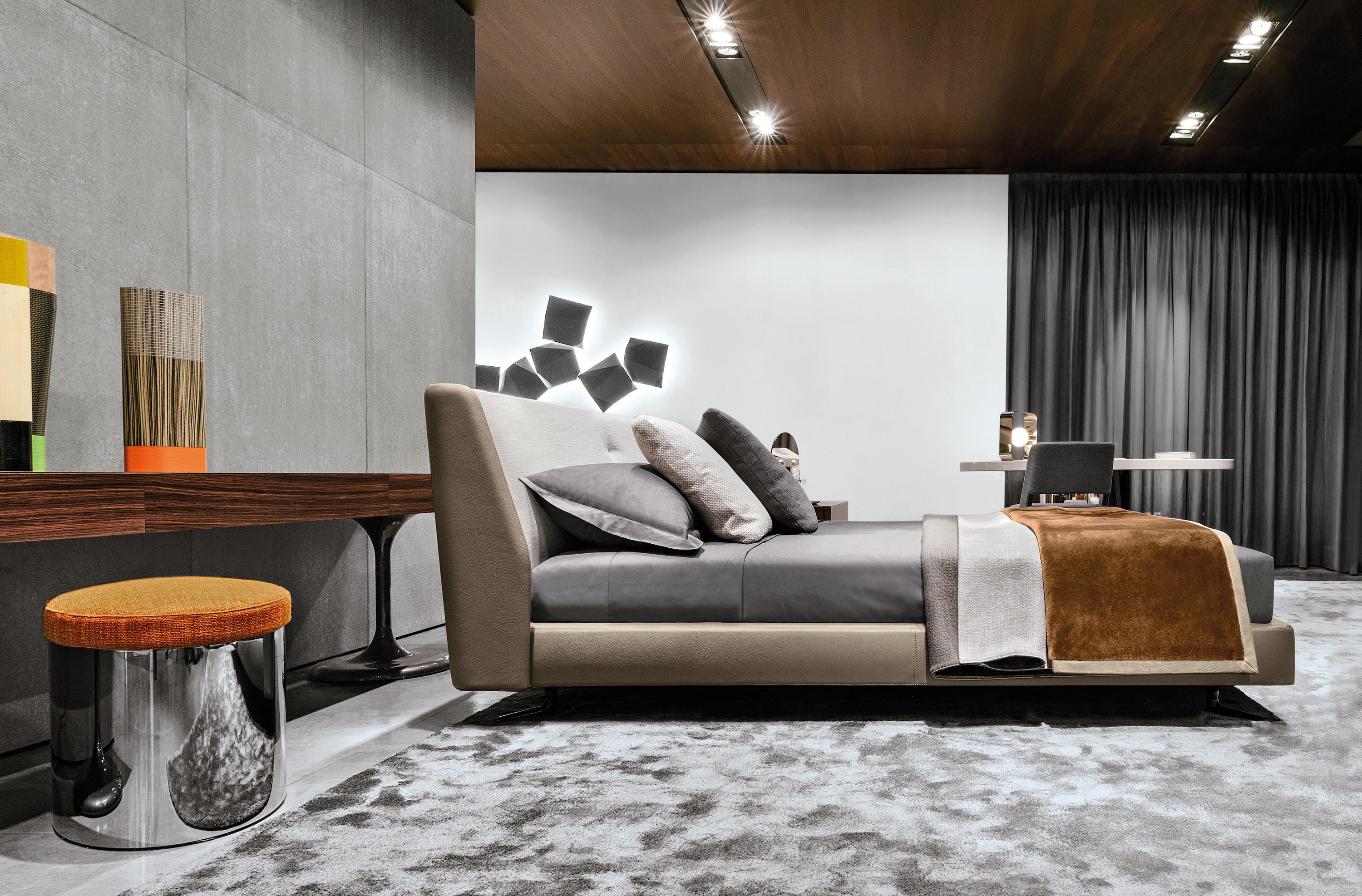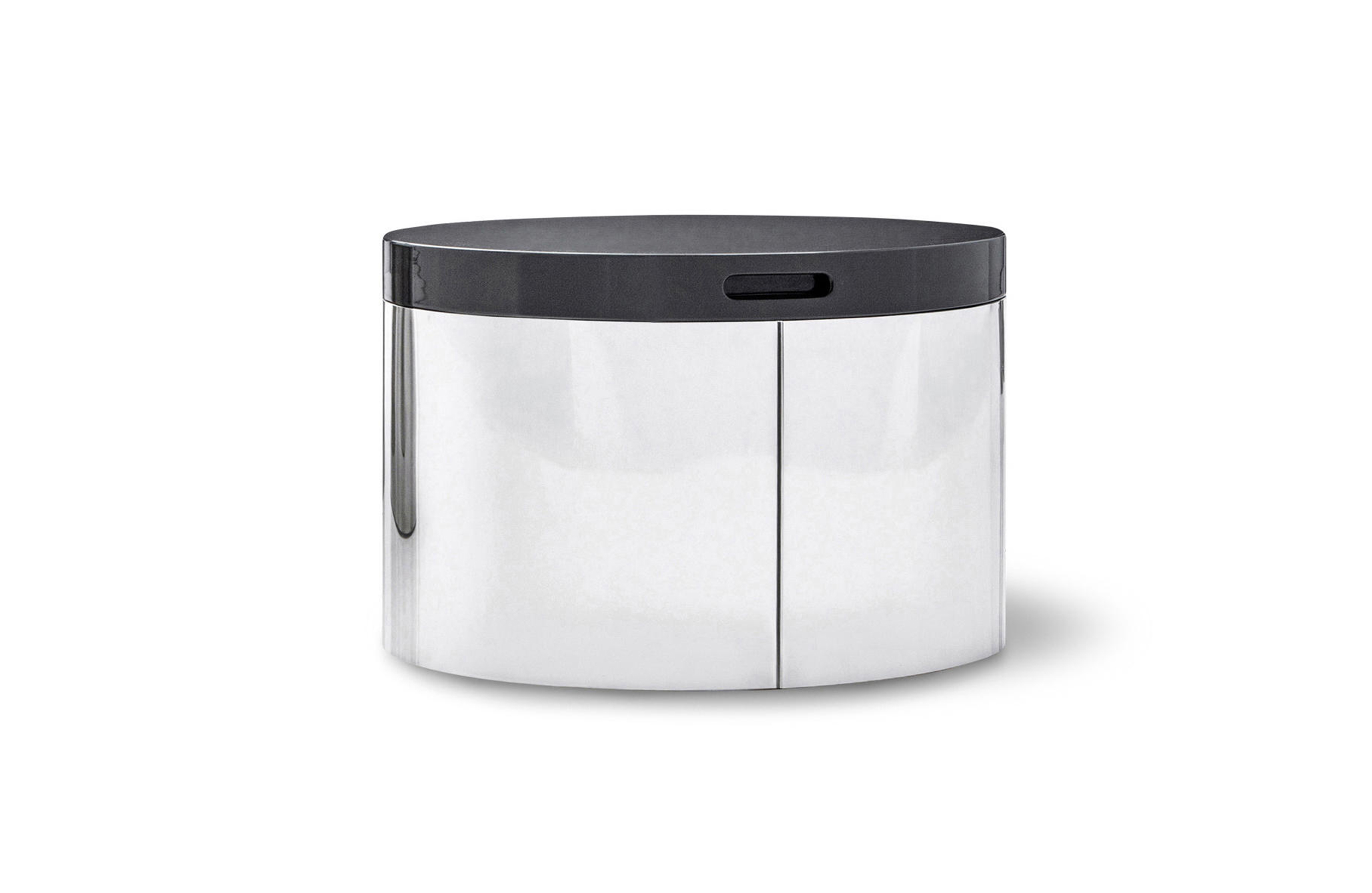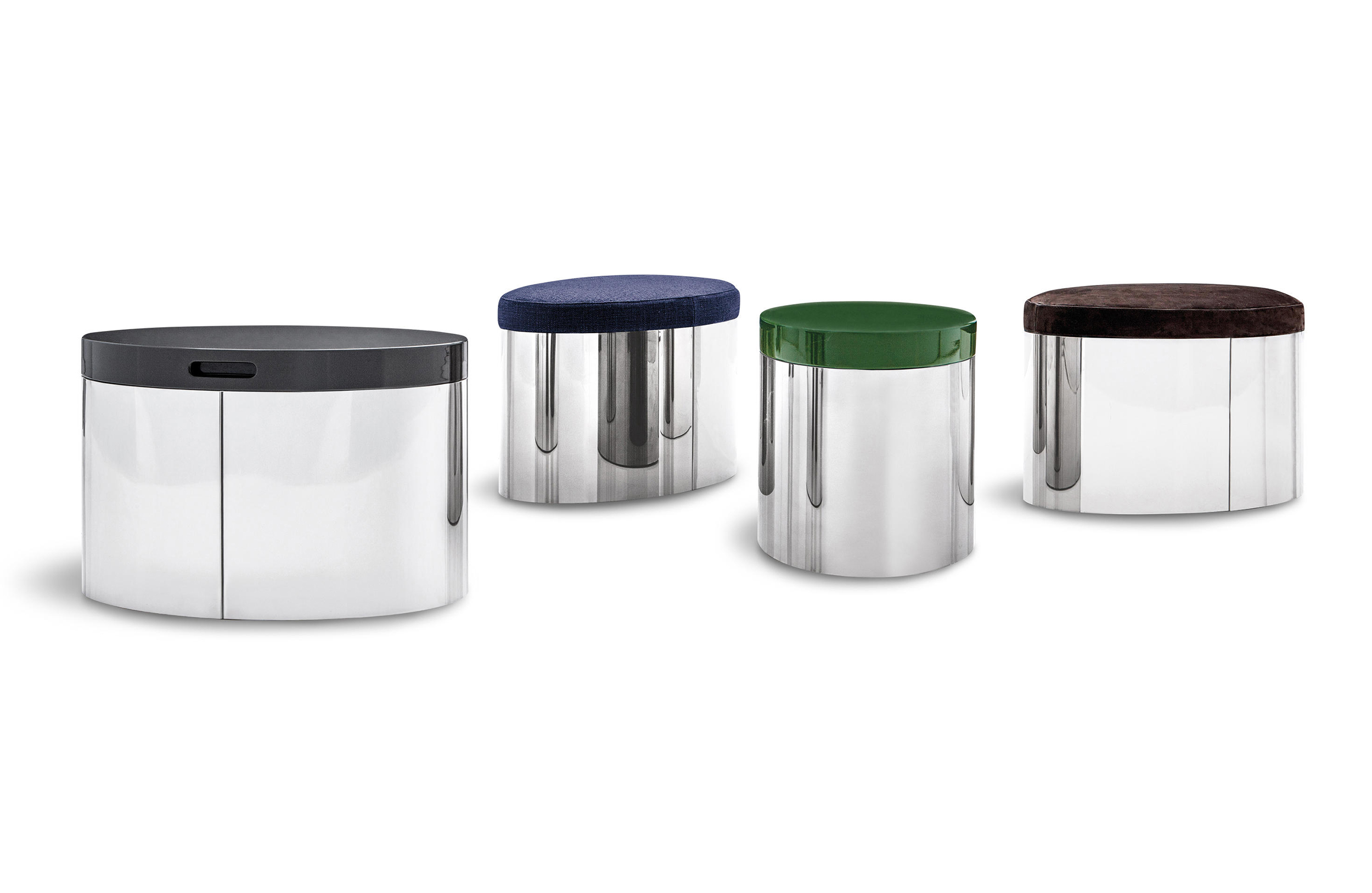 这款产品属于Raymond系列,但是又自成风格,可以作为边几也可以成为座椅,其内部还有一个极为实用的杂志收纳空间。收纳凳的底部为黑色皮革饰面,印有Minotti的logo。上方部件采用亮光漆面,颜色为白色、Sand色、花岗石色、绿色和紫色,搭配实用的椭圆形内嵌手柄,以此可轻松提起顶盖。休闲凳版本的上方部件则添加填充物,包覆Minotti独家系列中的布料和皮革。