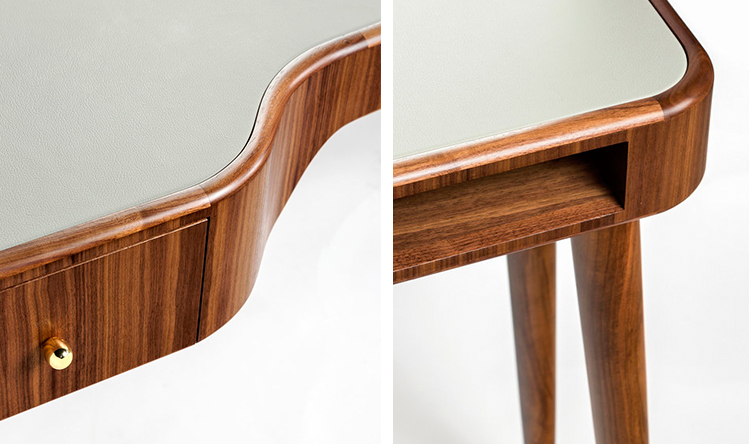 这张工作/化妆台左边有一个抽屉,右边有一个小壁龛,用来存放你的物品。表面皮革和黄铜是可定制的。