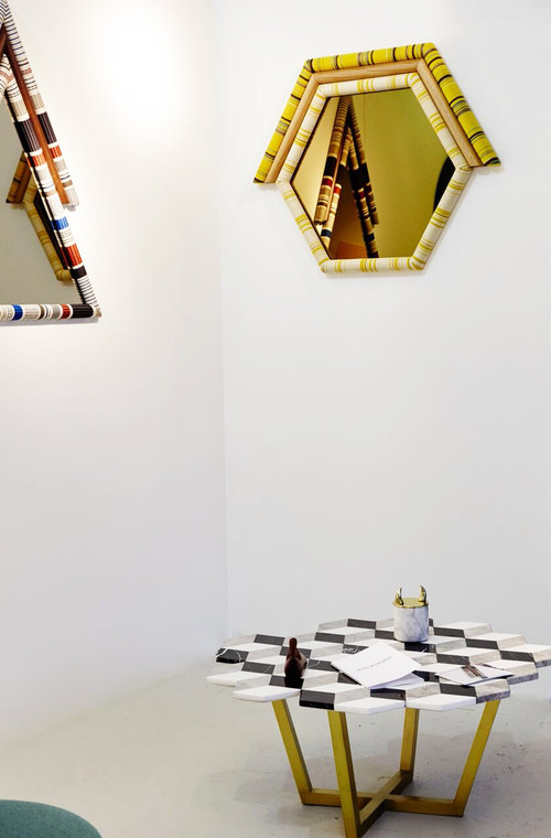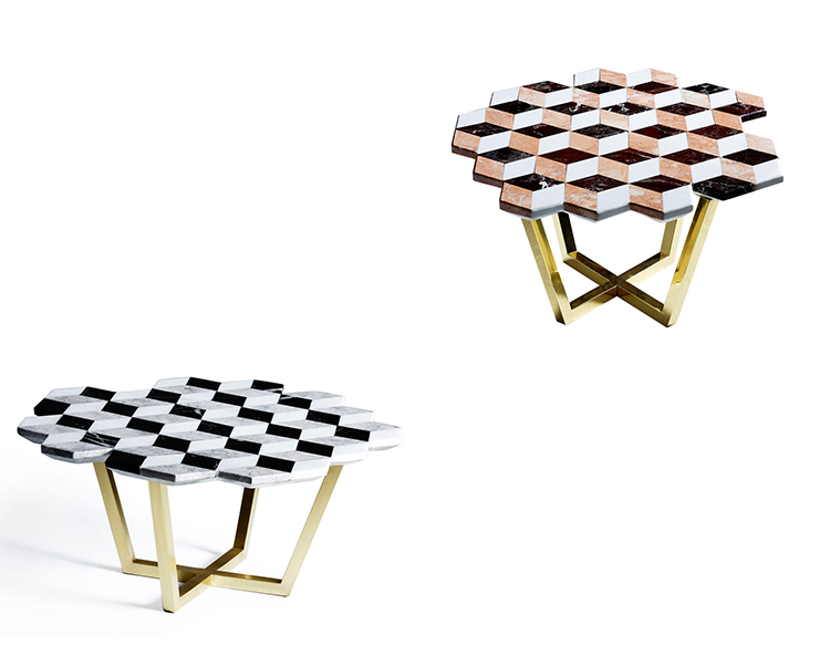 复视咖啡桌(Diplopia coffee table)是从创建一个传达视觉错觉的物体的想法中构思出来的。通过组合不同种类的大理岩产生立体效应。大理石桌面的不对称形式增加了复视的幻觉。复色的单色和彩色版本是用抛光或未抛光的铜腿制成的。更大的尺寸可根据要求提供。