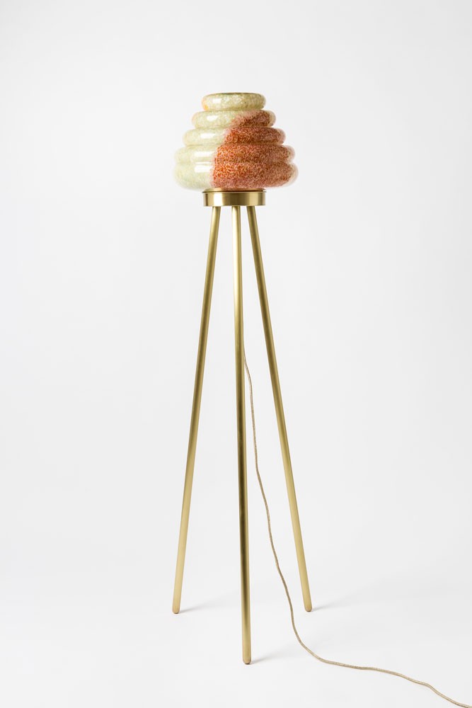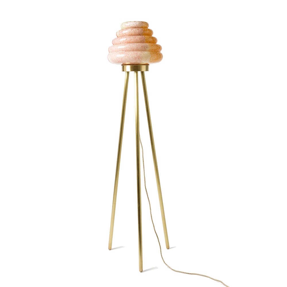 这款蜂巢式落地灯包括混合彩色手工吹制玻璃灯罩以及木质贴面腿和铜的不同组合。 第二个版本的Colmena有点缀图案的玻璃罩和哑光黄铜腿。 灯可通过调光器调节。 每件作品都是独一无二的,并定制。