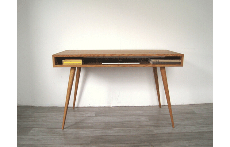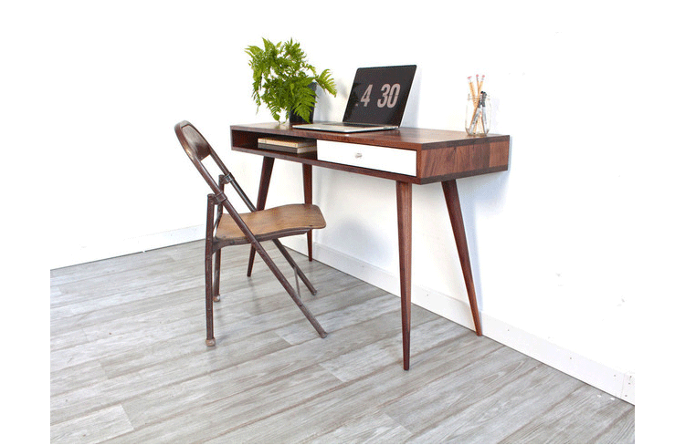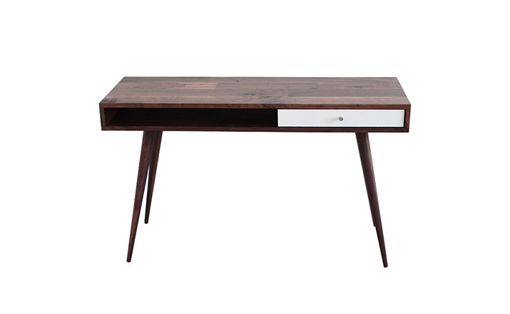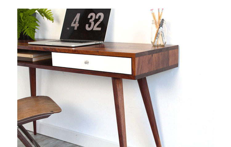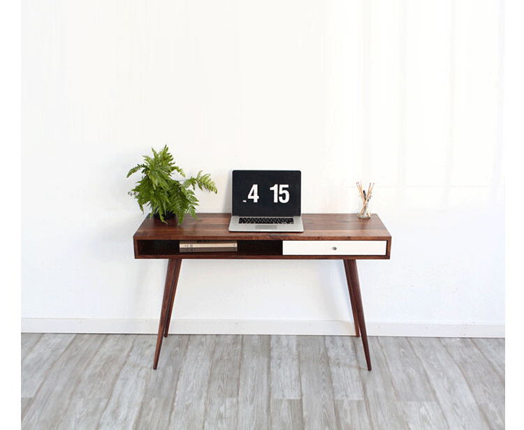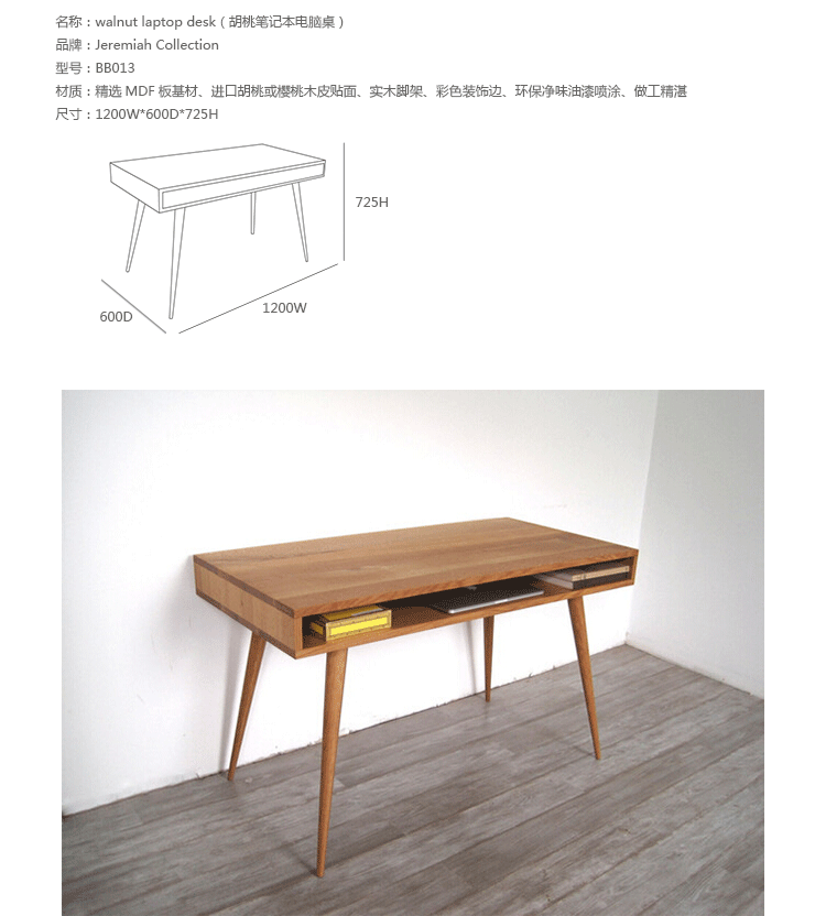 walnut laptop desk(胡桃笔记本电脑桌),中世纪风格,核桃实木精心制作,对于那些在家里工作的人来说,其可以舒舒服服地放在一个小办公室或公寓卧室,设有一个抽屉和开放空间以存放您的平板电脑或其他设备。制作采用精选MDF板基材、进口胡桃或樱桃木皮贴面、实木脚架、彩色装饰边、环保净味油漆喷涂、做工精湛。