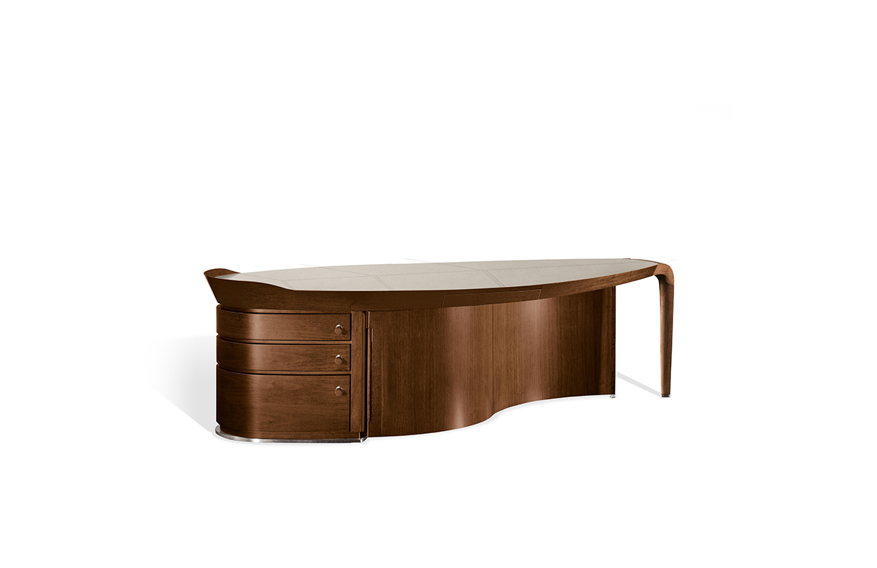 大班台框架,顶部和固体的五斗橱 国家胡桃木单板,可在自然完成,烟草的颜色 完成和黑胡桃木。 腿之间的连接 和腿都在核桃卡纳莱托木与自然完成。