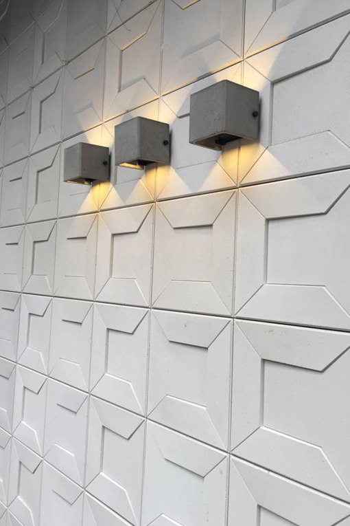 "V"壁灯可室内与户外兼用,防水等级 IP65; 内含挡光黑色金属片可以自由调节光线方向,呈现的光影效果丰富多变。