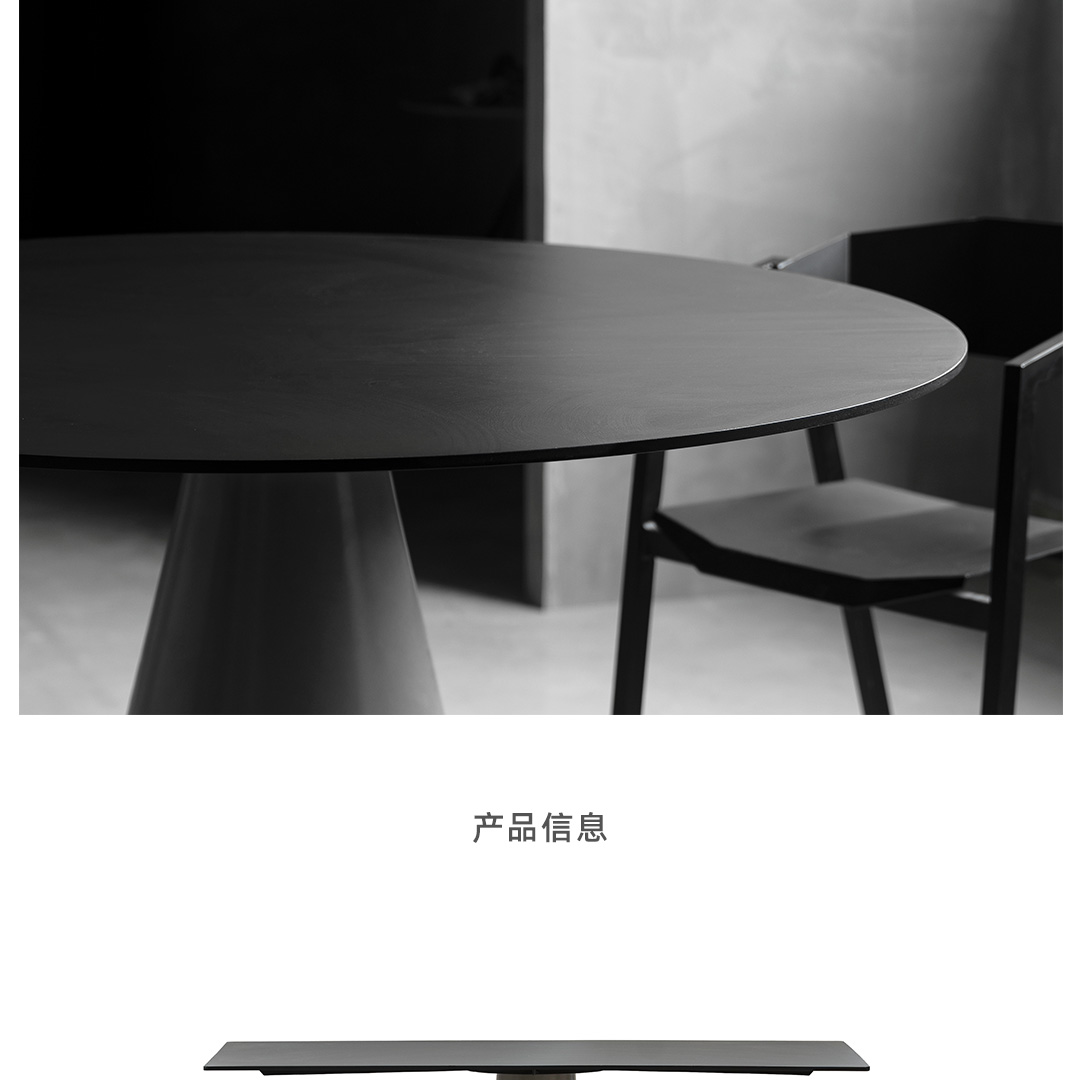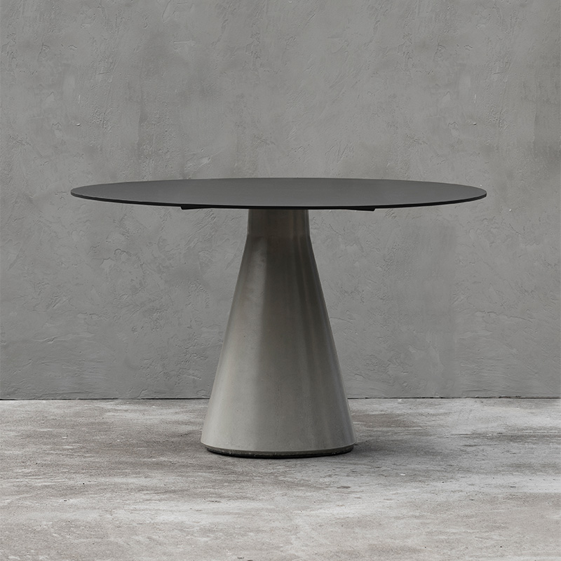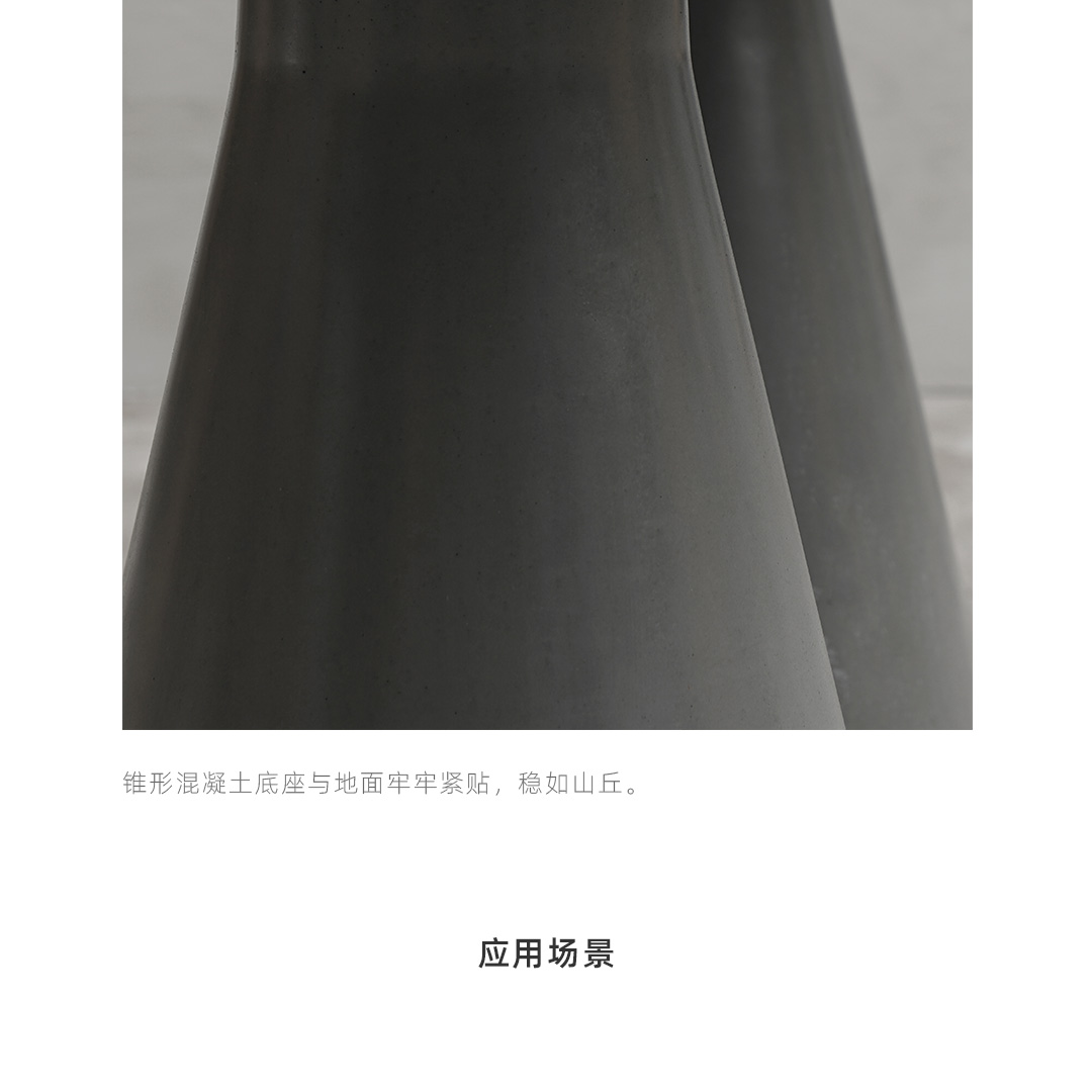 锥形几何建筑贯穿了人类整个文明,从原始的部落帐篷,到埃及、罗马石柱,至巨大的混凝土发电站建筑,是最稳定可靠的几何形态,是代表稳定的萃取形态, 利用建筑废渣与混凝土浇筑成底座,是桌子稳健的基石。 底部布满筋骨的全铝桌面,像巨大的太空飞船,厚重的金属怪物从天而降落,在人类文明石柱上筑起巢穴,对无味的空间发起挑战。