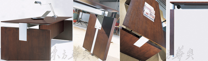 ※  相互重叠的板面组合与因应几何结构摆设的CG-BEX008-D02系列,最能配合讲究设计的时尚办公室环境-各个独立板面采用悬浮形式组合,令实木用料感觉灵活轻盈;设计修长的主桌与两件侧脚板相连,客户亦可因应需求加置侧柜构成L型工作桌,半悬式实芯桌前挡板配搭银色聚氨酯盖面连接板,此款班台加添精巧美感。
