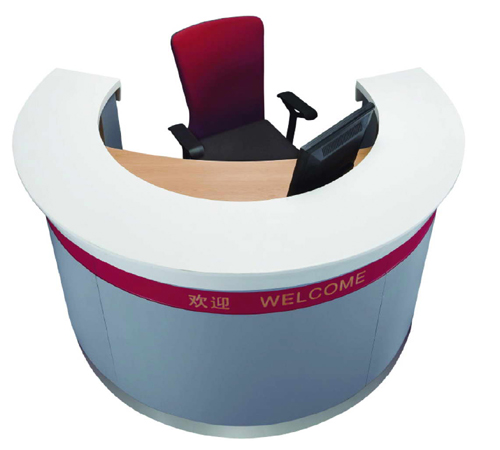 咨询服务台采用标准化的半圆角设置,台身设计严格按照银行统一标准,尺寸及弧度度量精确,标志设置清晰,且观赏性十足,台面采用浅色木色面和白色人造石台面相配搭,显得美观醒目。