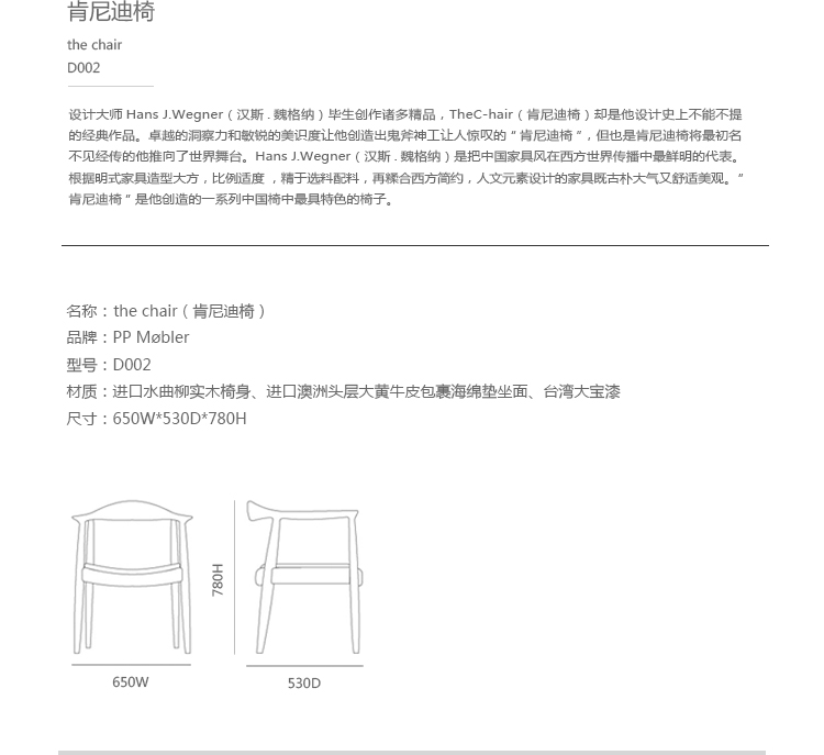 汉斯·韦格纳是把中国家具风在西方世界传播中最鲜明的代表。根据明式家具造型大方,比例适度 ,精于选料配料,重视木材本身的自然纹理和色泽等优点再糅合西方简约,人文元素设计的家具既古朴大气又舒适美观。“肯尼迪椅”是他创造的一系列中国椅中最具特色的椅子。