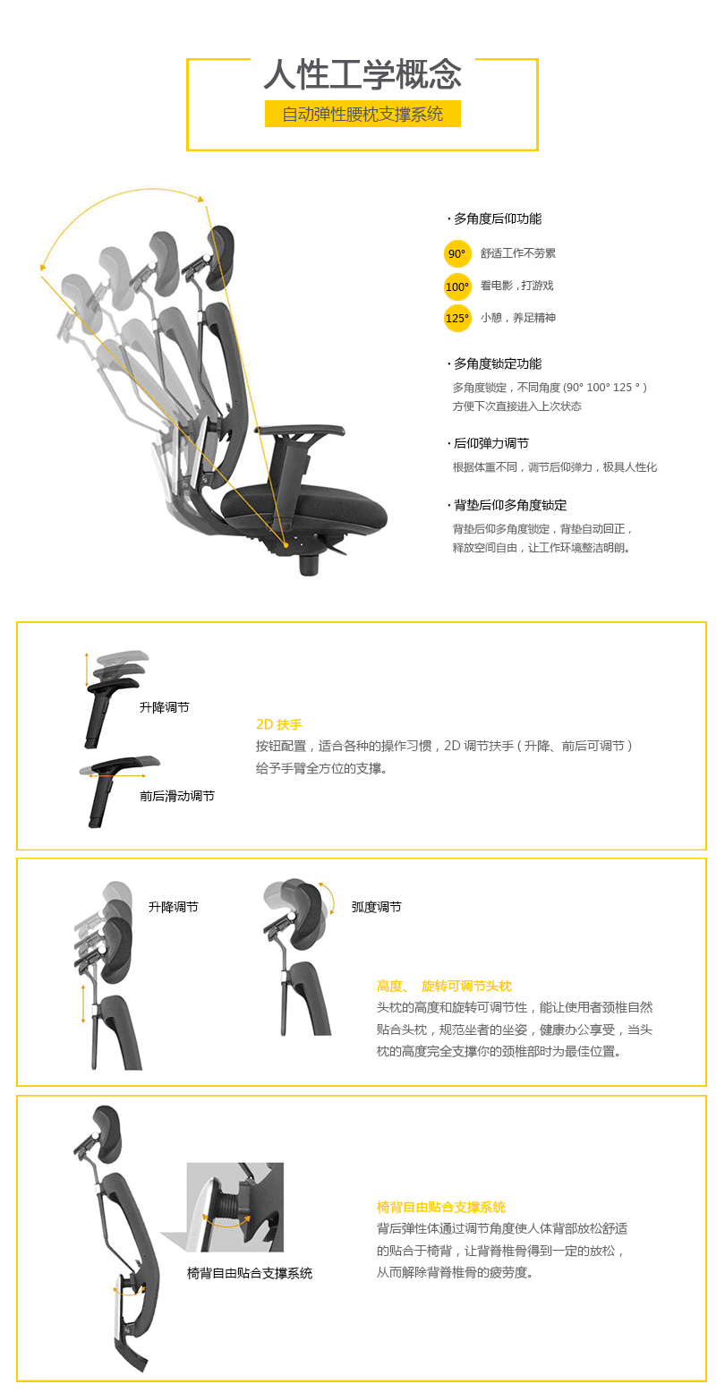 CG-E1054的优美设计有利于持久的舒适和美感。工学椅的结构和功能利用同步倾仰底盘控制功能锁定,滑座和高度调节。高度和角度均可调的扶手和头枕都包含在这张特有的工学椅里。