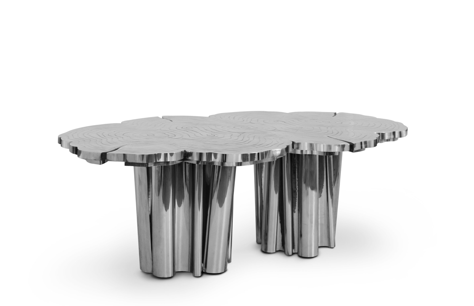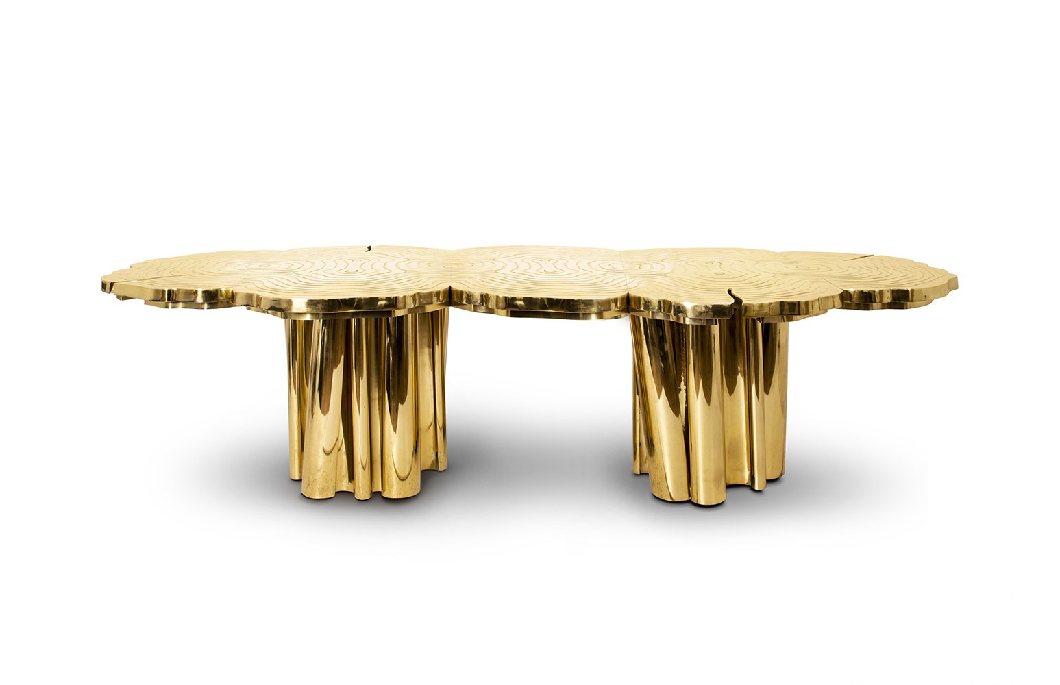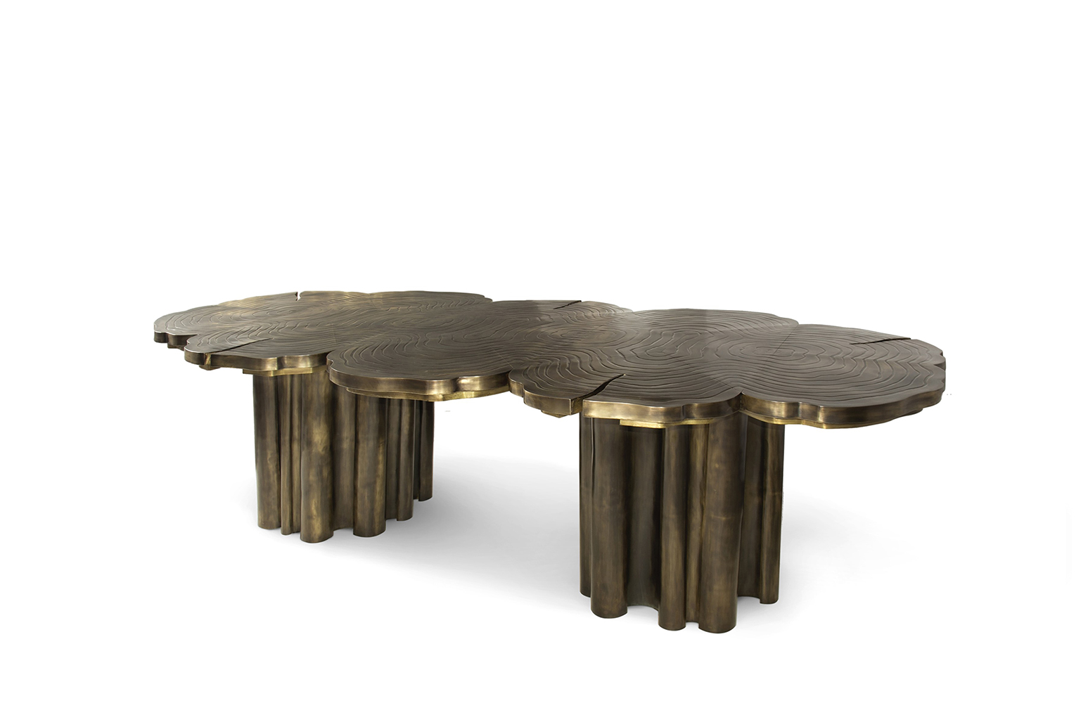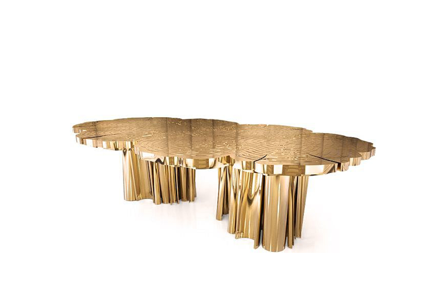 A fresh contemporary dining table and a shimmering statement from Boca do Lobo. Fortuna represents the materialization of luck and fortune, a symbol of the control of life and the definition of fate. An elegant composition of scaled brass tubes supporting the outlines of log rings in brass, related do the time life of a tree. Available in iron and copper