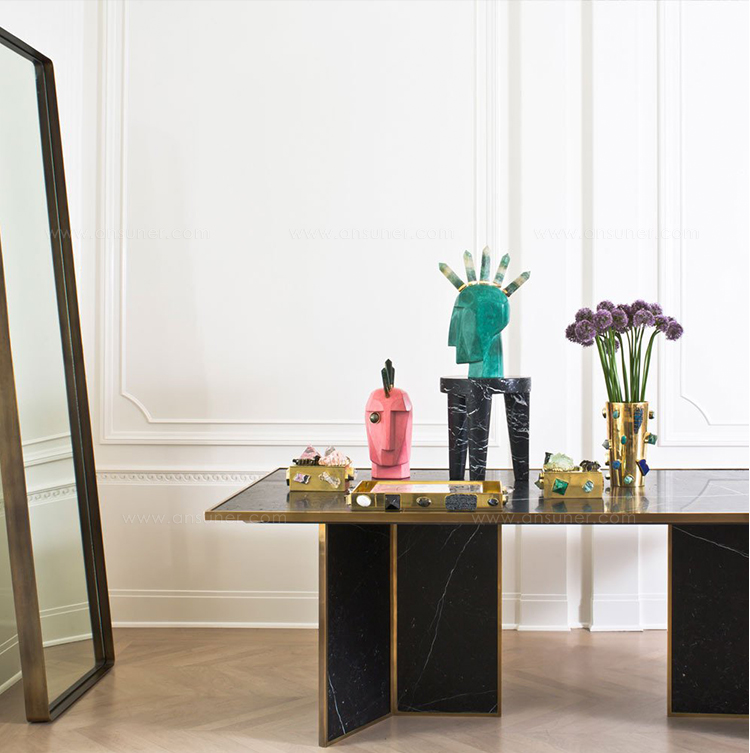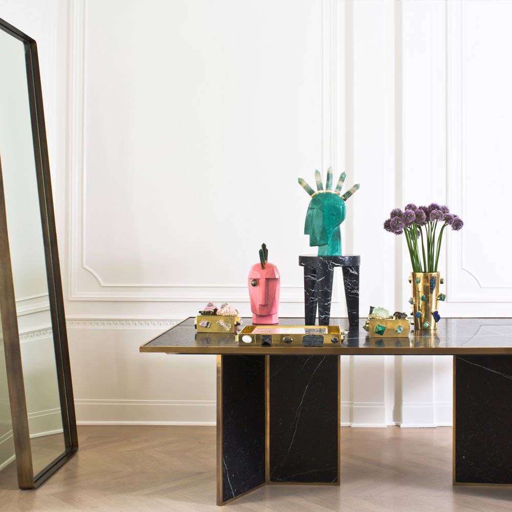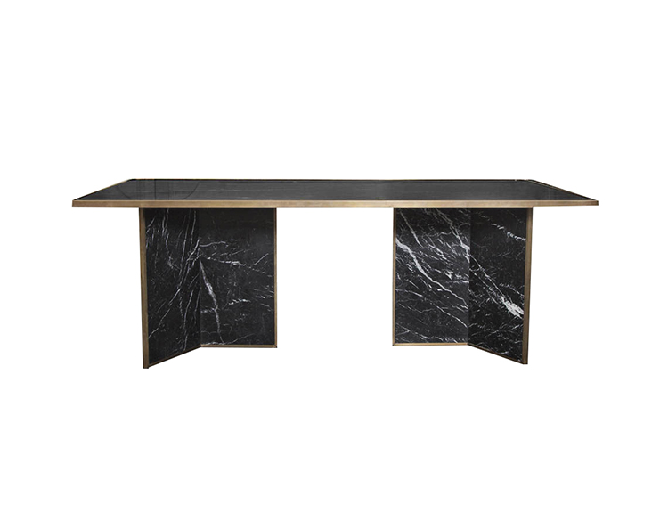 Liaison餐桌具有永恒性和现代感,又体现了凯利对混合材料的热爱。 这款优雅而简约的桌子由巨大的磨砂和密封的黑色Marquina大理石平面组成,饰有古董青铜边缘细节。