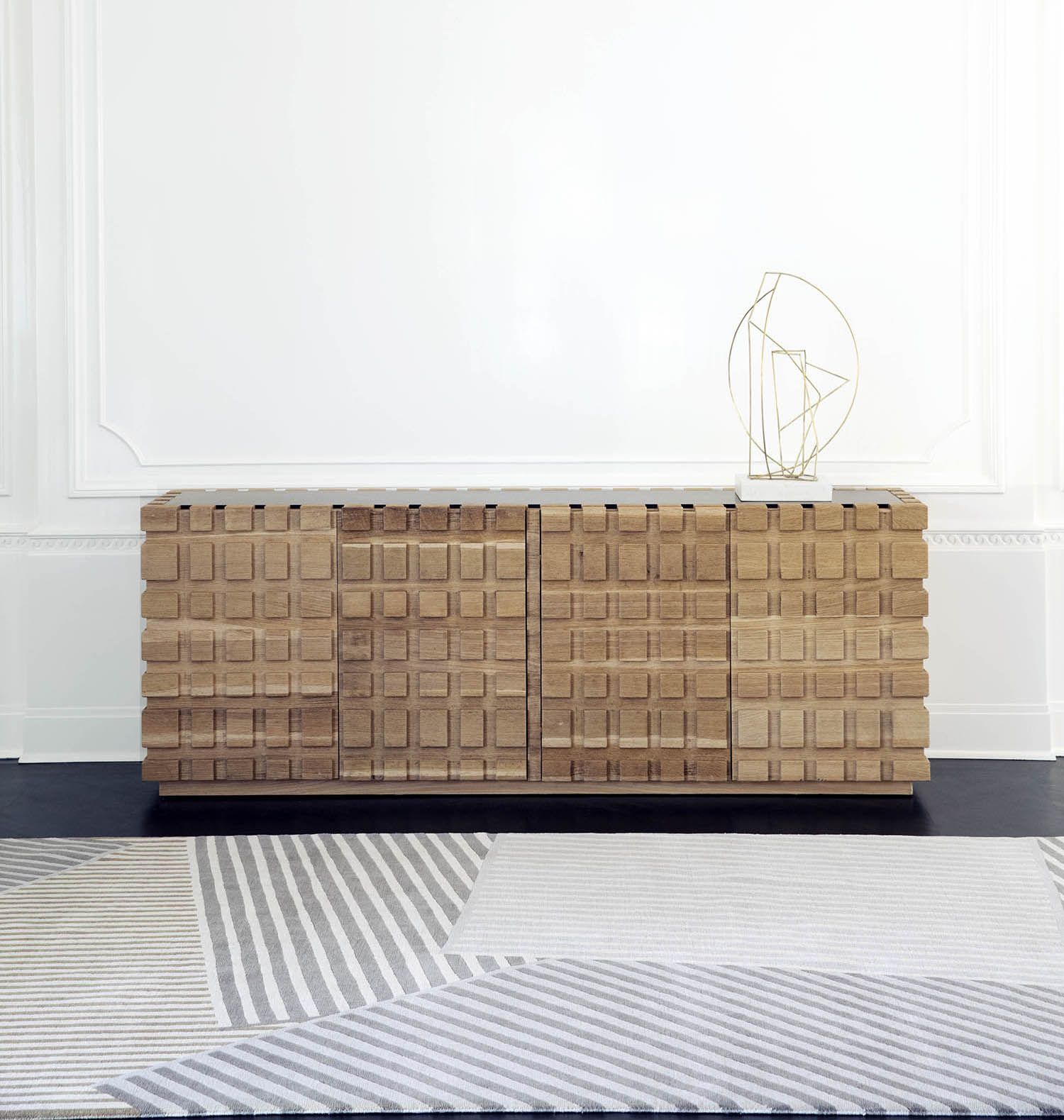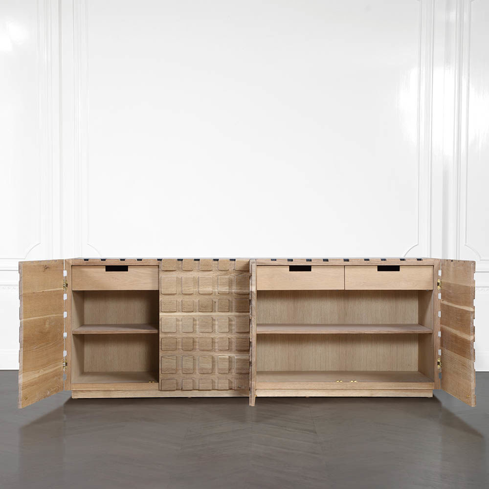 太平洋书柜的几何正面和侧面,由坚固的四分之一锯橡木雕刻而成,为这款巨大的低控制台带来了坚固的精致。 顶部镶嵌的金属丝拉丝大理石增加了整体的原始精致感。