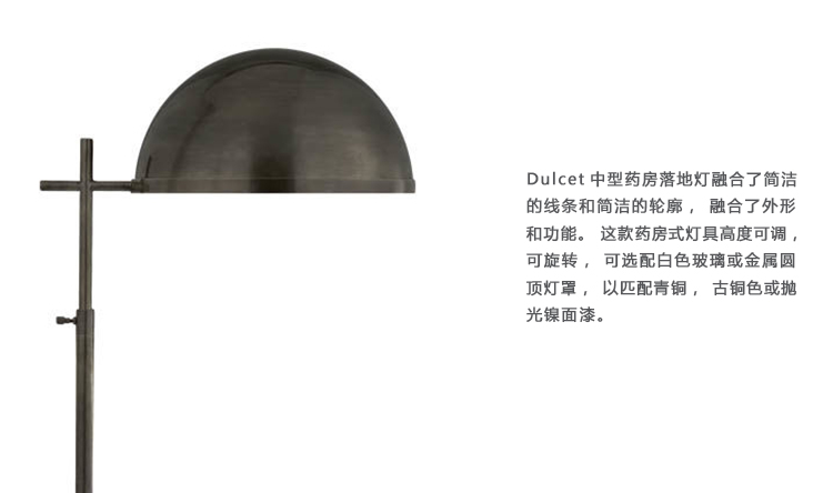 Dulcet中型药房落地灯融合了简洁的线条和简洁的轮廓,融合了外形和功能。 这款药房式灯具高度可调,可旋转,可选配白色玻璃或金属圆顶灯罩,以匹配青铜,古铜色或抛光镍面漆。