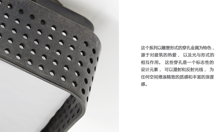这个系列以雕塑形式的穿孔金属为特色,源于对建筑的热爱,以及光与形式的相互作用。 这些穿孔是一个标志性的设计元素,可以漫射和反射光线,为任何空间增添精致的质感和丰富的深度感。 提供古董抛光黄铜,青铜和抛光镍与云雾玻璃。