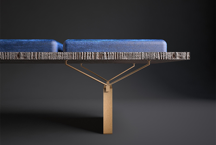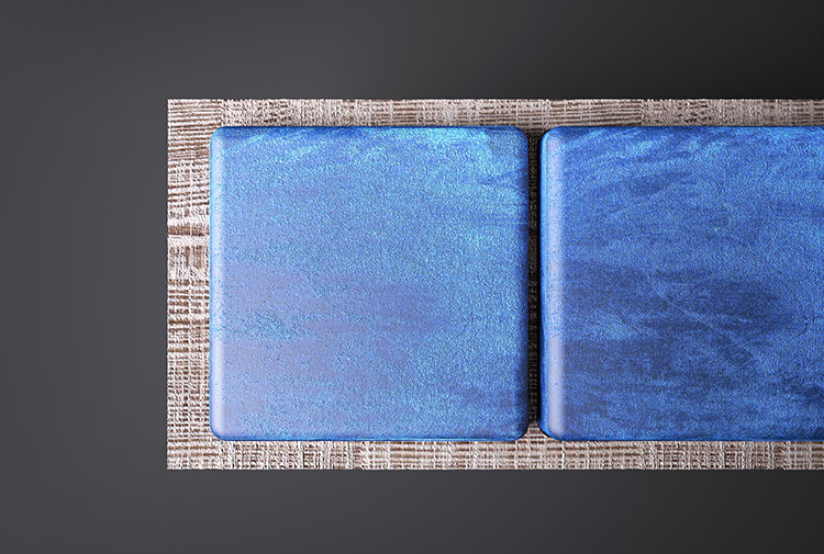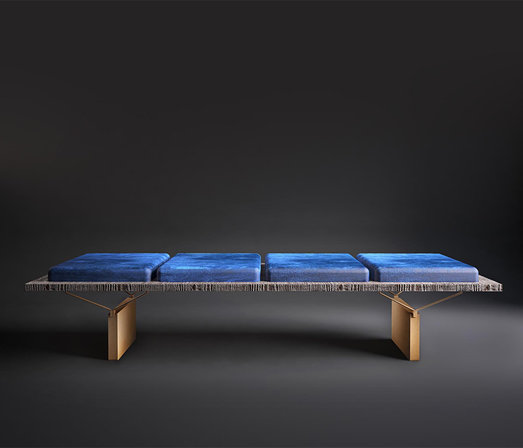 一个“没有多余装饰”的长椅,但却无法实现:通过在绒面革的柔软度和厚厚的蓝色垫子之间展现色彩,Stamford使原木座椅高贵。 薄的关节支撑着座椅,而抛光的金属腿为家具增添了优雅和轻盈。