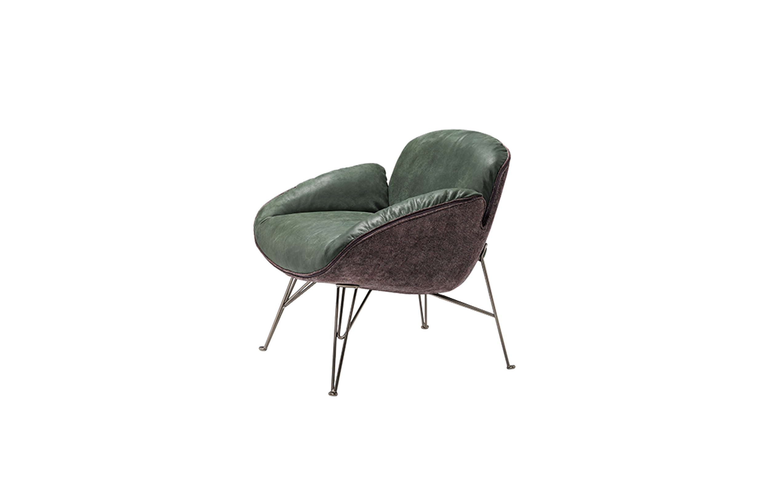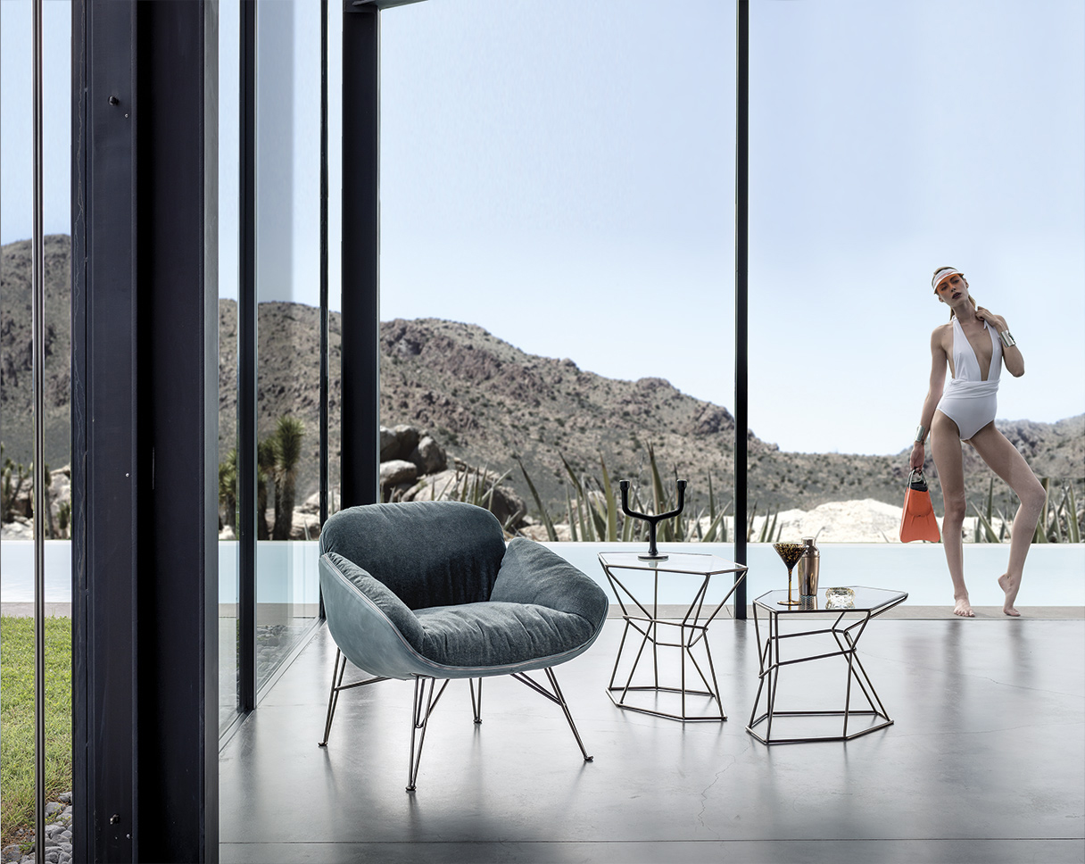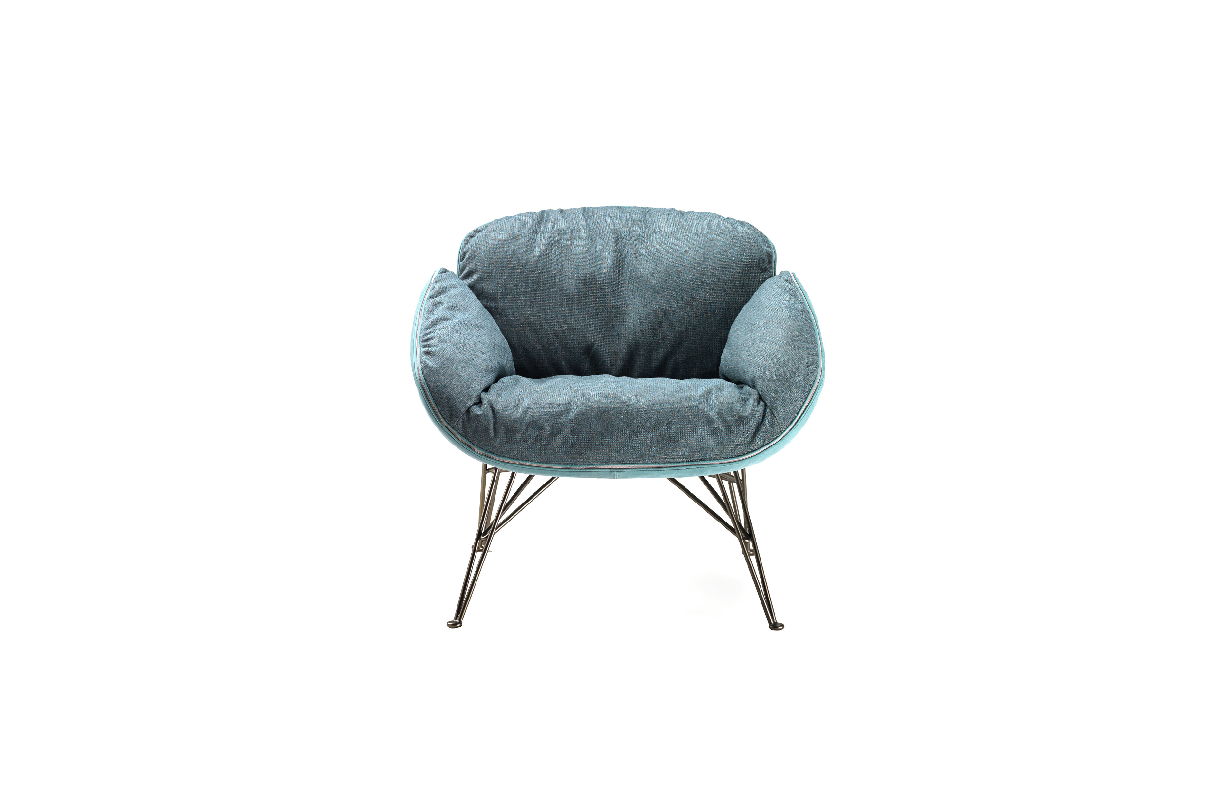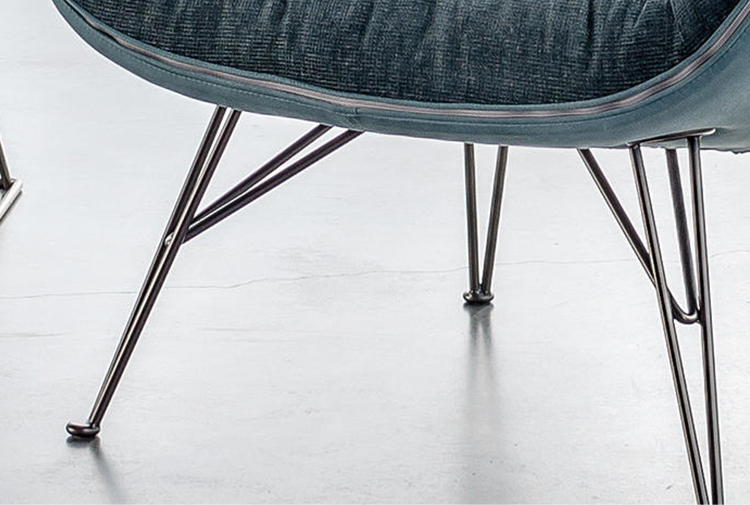 在扶手椅朱诺的背部和手臂柔软的衬垫与薄结构的严谨性形成鲜明对比。一条细长的线连接着内部和外部的部分。拉链在扶手周边区域运行,在各个部分之间创建了一个令人着迷的连接。框架由四个金属脚组成,它们构成了光的三维形态。