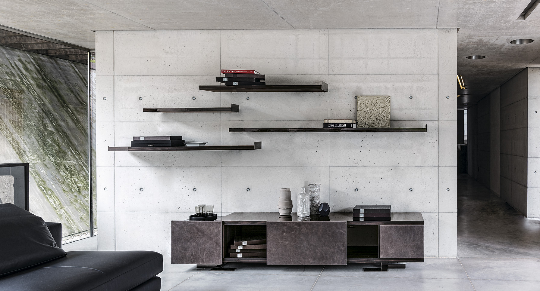 Endor餐具柜的特点是独立而精确的图形设计,就像一个荒岛。由于它的结构和开放的架子,它可以放置在墙壁或客厅。柜体由摩卡橡木、柚檀和乌木制成,柜门上面覆盖了列奥纳多的真皮。金属底座可以用云母棕或黑镍制成。