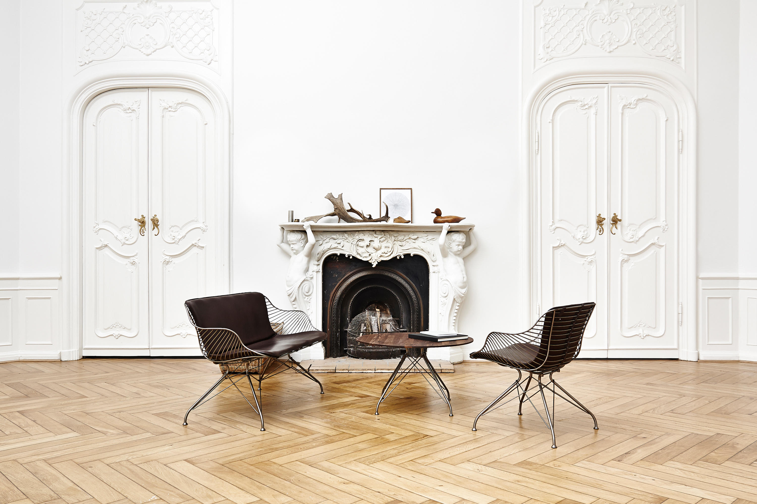 金属丝茶几由Jasper Overgaard和Christian Dyrman设计。2014年设计的金属丝躺椅是一种更低、更宽、更平放的版本,与铁丝餐椅相比。