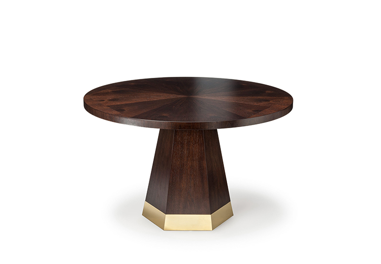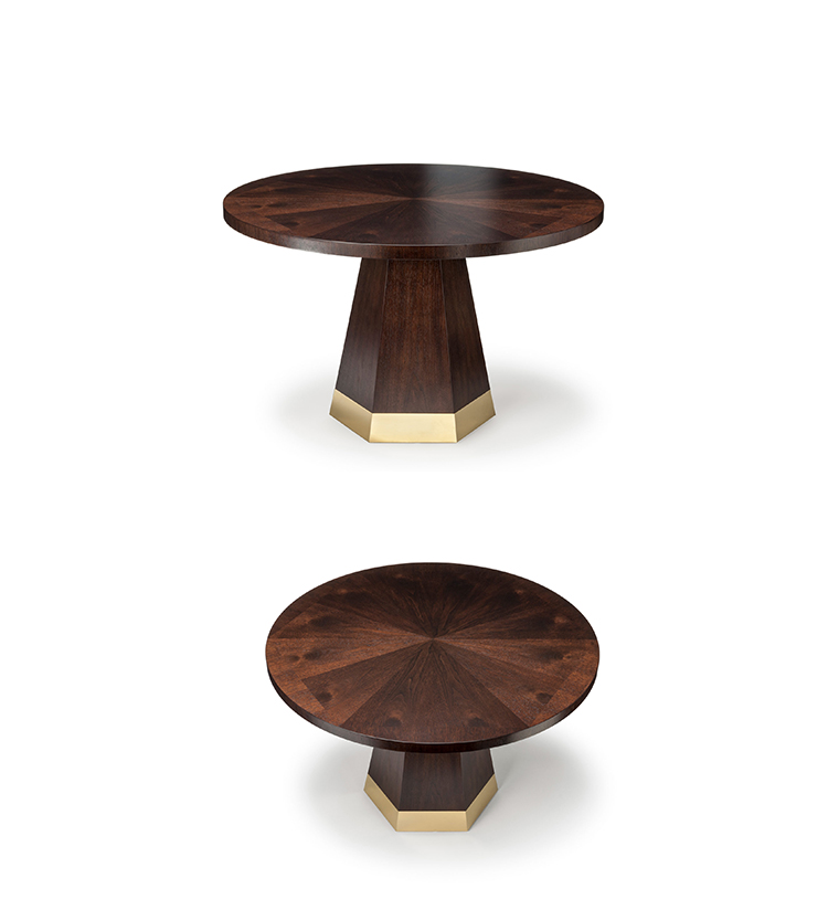 中心针茶几,圆形桌面和圆锥形六角棱柱底座。 桌面有六个部分,钻石单板匹配,产生径向效果。