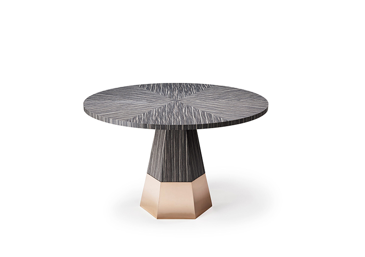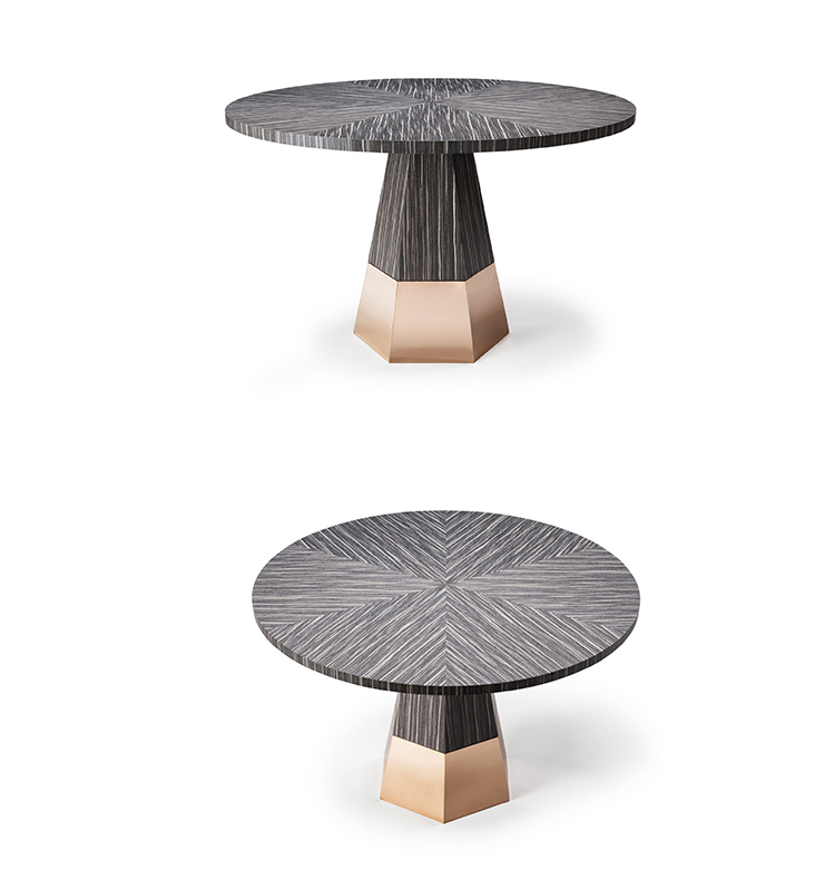 桌面有六个部分,钻石单板匹配,产生径向效果。 桌脚有一个大型铸造金属脚。
