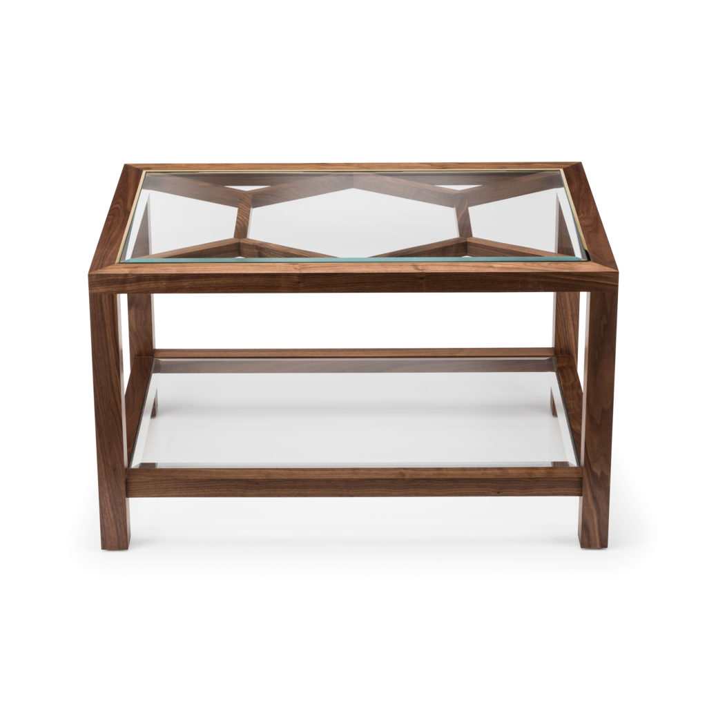 Expressing pattern beautifully, our Archebee Side Table is hand constructed of solid American black walnut and beveled glass with metal detailing. Its inherent strength and delicate form arises from where the beautiful rudiments of geometric form meet natural materials.