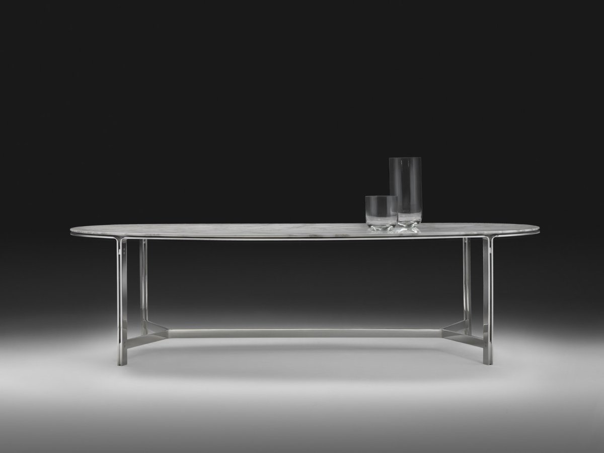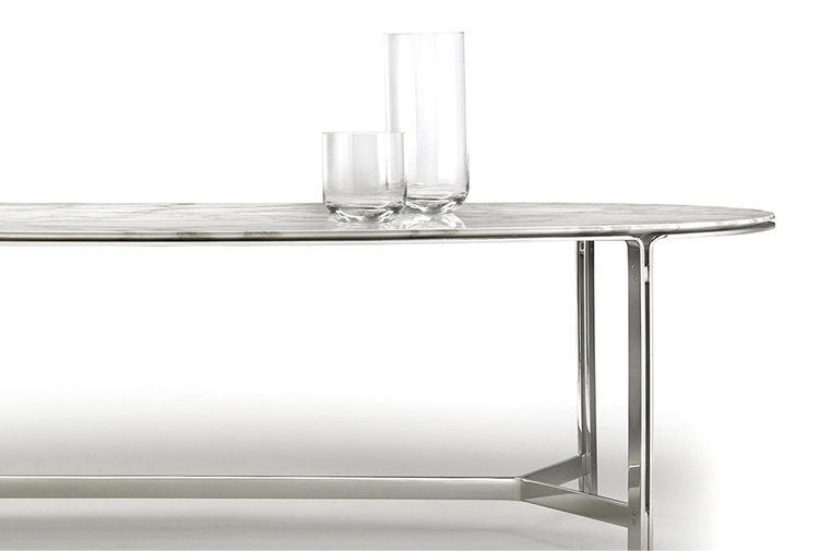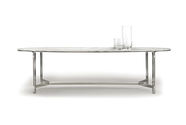这是一张优雅的餐桌,也被解读成圆形的咖啡桌。CLARKE的金属结构是由腿部延伸到大理石或实木的桌面。桌面以一种不同寻常的椭圆形形式存在,同时保留坚定地结构。